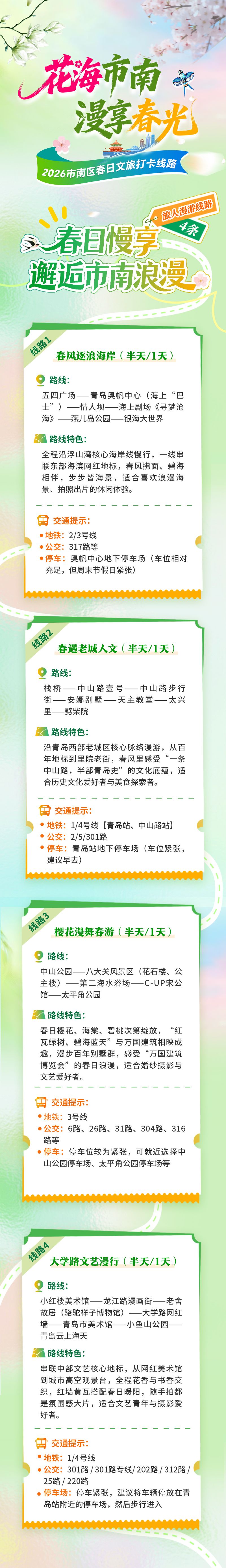 青岛日报社/观海新闻4月6日讯 春风逐浪,向海而行。日前,“花海市南·漫享春光”2026春日文旅消费季推出4条旅人漫游线路。一步一景皆是碧海春光,是春日休闲、拍照出片的绝佳选择。