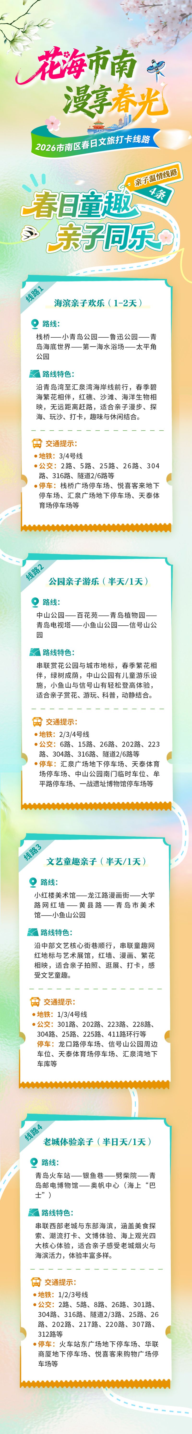 此外,“花海市南·漫享春光”2026春日文旅消费季还推出4条亲子温情线路。海滨踏浪、公园赏花、文艺打卡、老城寻味,每一条都适配亲子出行,把春日美好打包给每一个家庭。(青岛日报/观海新闻记者 曹森)
