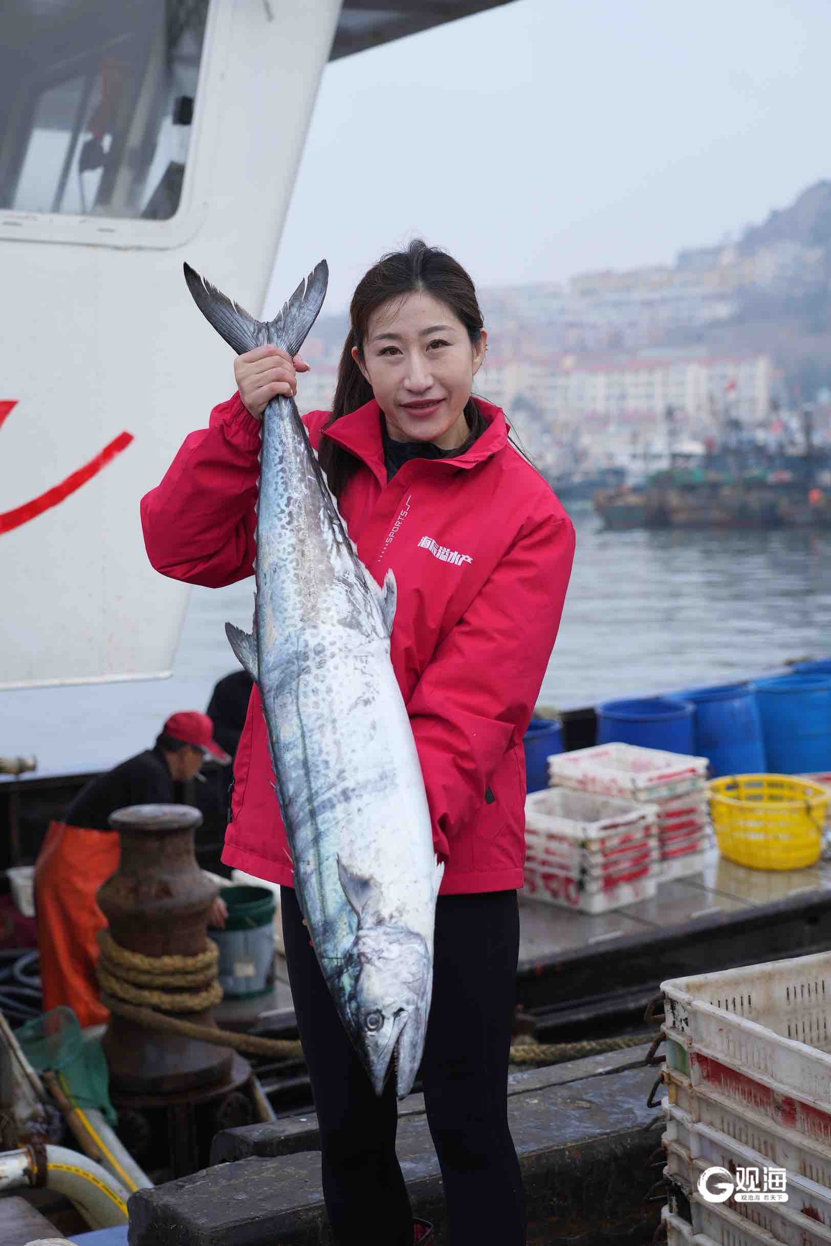 船员们弯腰搬运、分拣码放,动作麻利有序;商贩们围拢上前,挑选着心仪的鲅鱼,称重、议价、装车一气呵成。“新鲜上岸的本地大鲅鱼不打弯,看看咱这质量,弹性相当好。鱼鳃鲜红,背部是蓝黑色,有明显的蓝色斑点,肚皮是珍珠白色,身体中间这条长线泛着蓝绿光,在阳光照耀下更明显了。”西施牌鲅鱼负责人董子艺告诉记者,这一船鲅鱼有6000多斤,每条鲅鱼的重量在8斤到15斤。