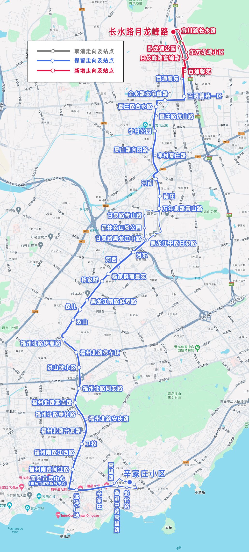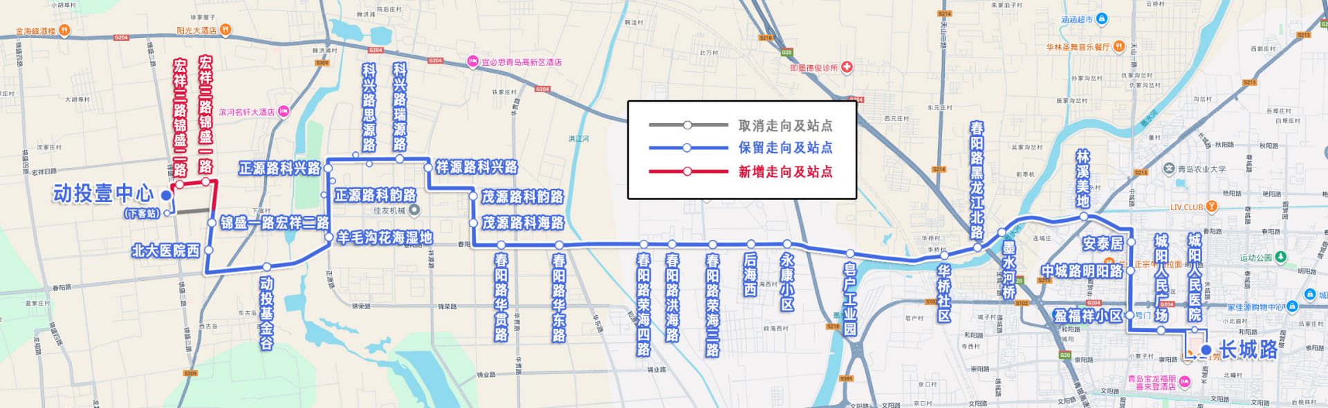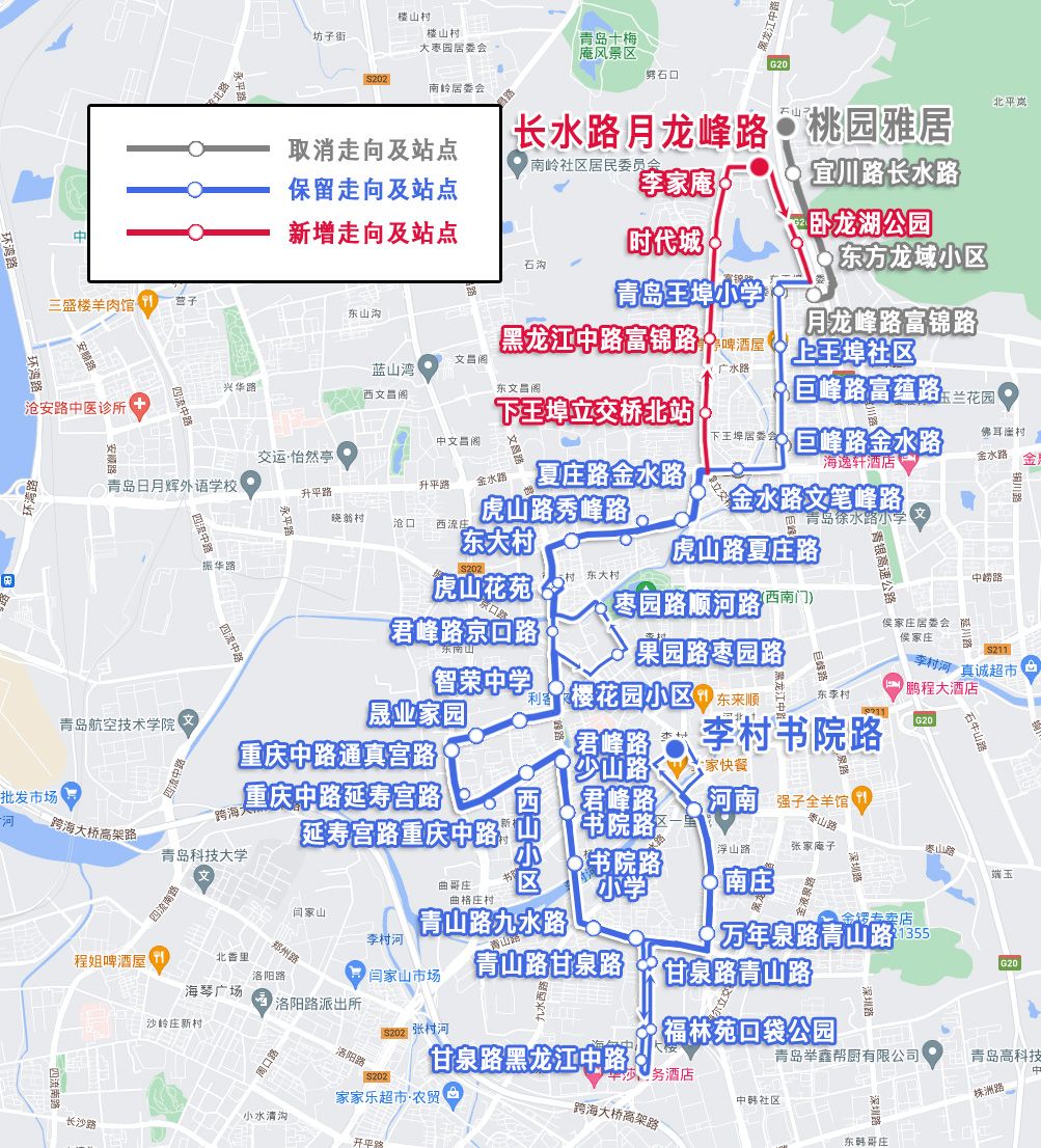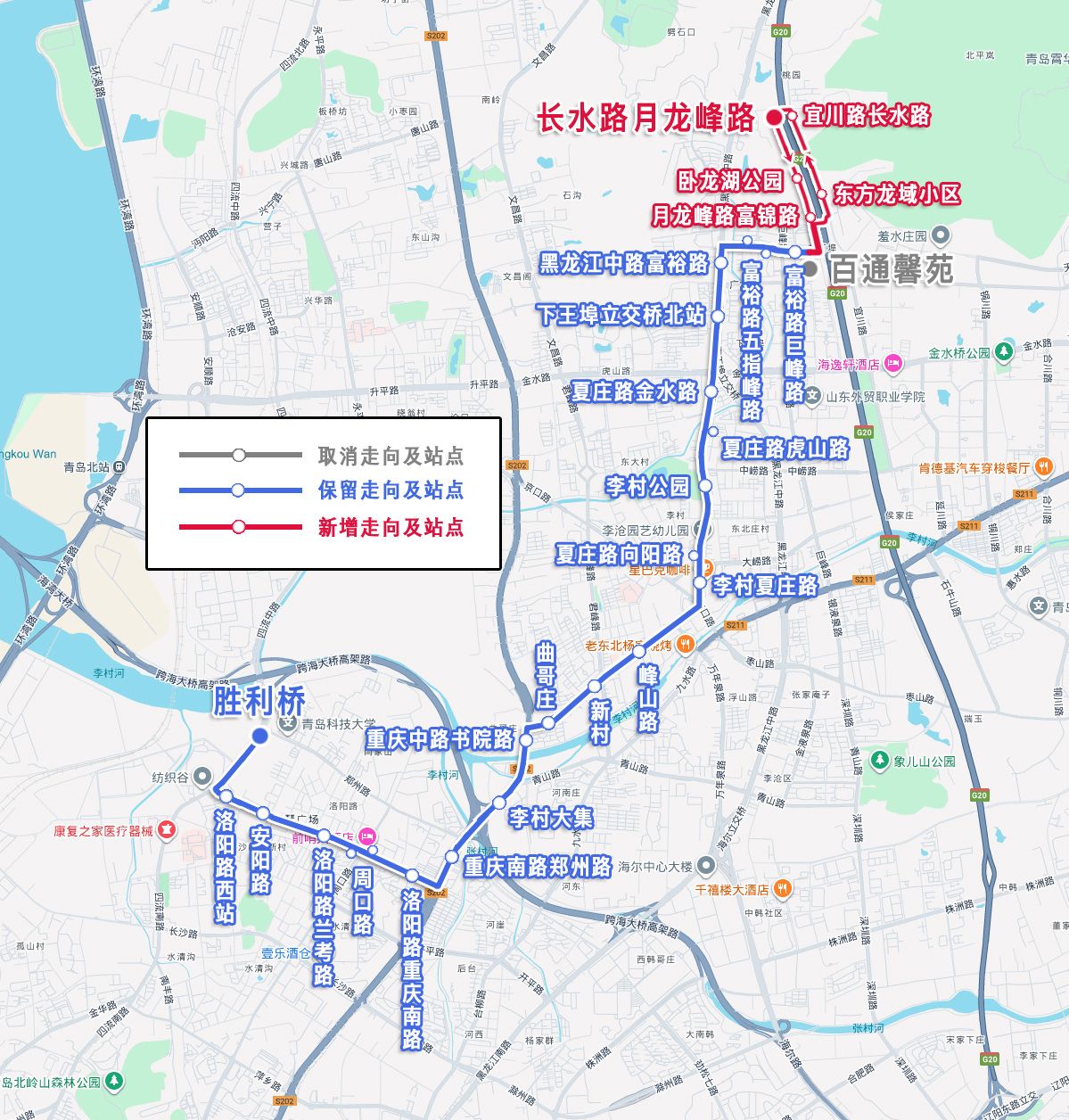 取消站:桃园雅居(双向)、宜川路长水路(双向)、东方龙域小区(双向)、月龙峰路富锦路(双向)、青岛王埠小学(仅上行)、上王埠社区(仅上行)、巨峰路富蕴路(仅上行)、巨峰路金水路(仅上行)、金水路文笔峰路(仅上行)。