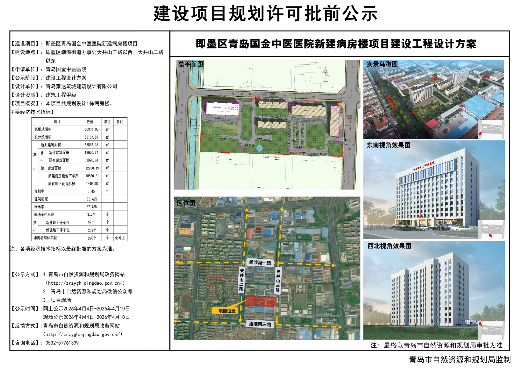 青岛日报社/观海新闻4月8日讯 日前,青岛国金中医医院新建病房楼项目建设工程设计方案公布,项目位于即墨区潮海街道办事处天井山三路以西、天井山二路以东。