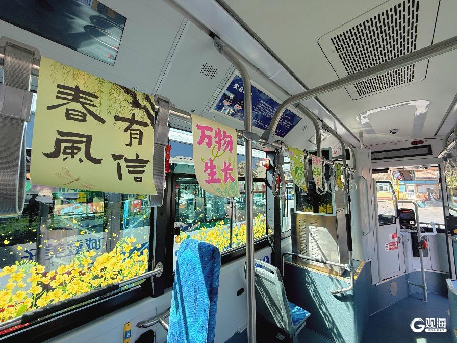 走进115路DD2561号车,浓郁的春日气息扑面而来。车厢扶手杆上,悬挂着“春风有信”“采春光迎春风”“万物生长”等春日氛围装饰,温馨而富有诗意;两侧车窗玻璃贴满了金灿灿的油菜花图案贴纸,放眼望去,仿佛置身花海之中。