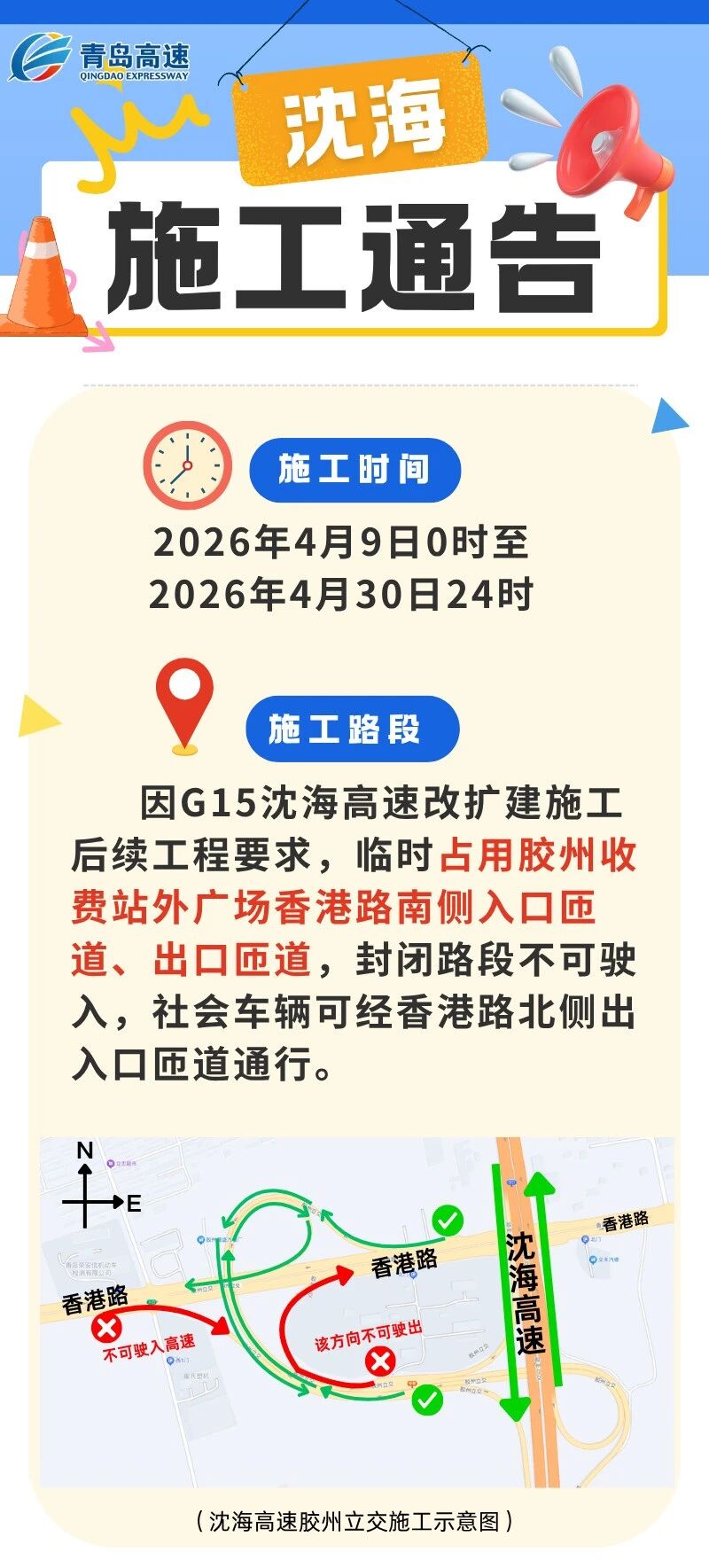 明天0时起施工,封闭路段不可驶入!青岛高速最新通告→ 2026-04-08 21:41 “青岛高速出行服务平台”微信公众号 0 4月8日,青岛高速出行服务平台发布沈海高速施工通告。↓↓↓ 责任编辑:孙源熙