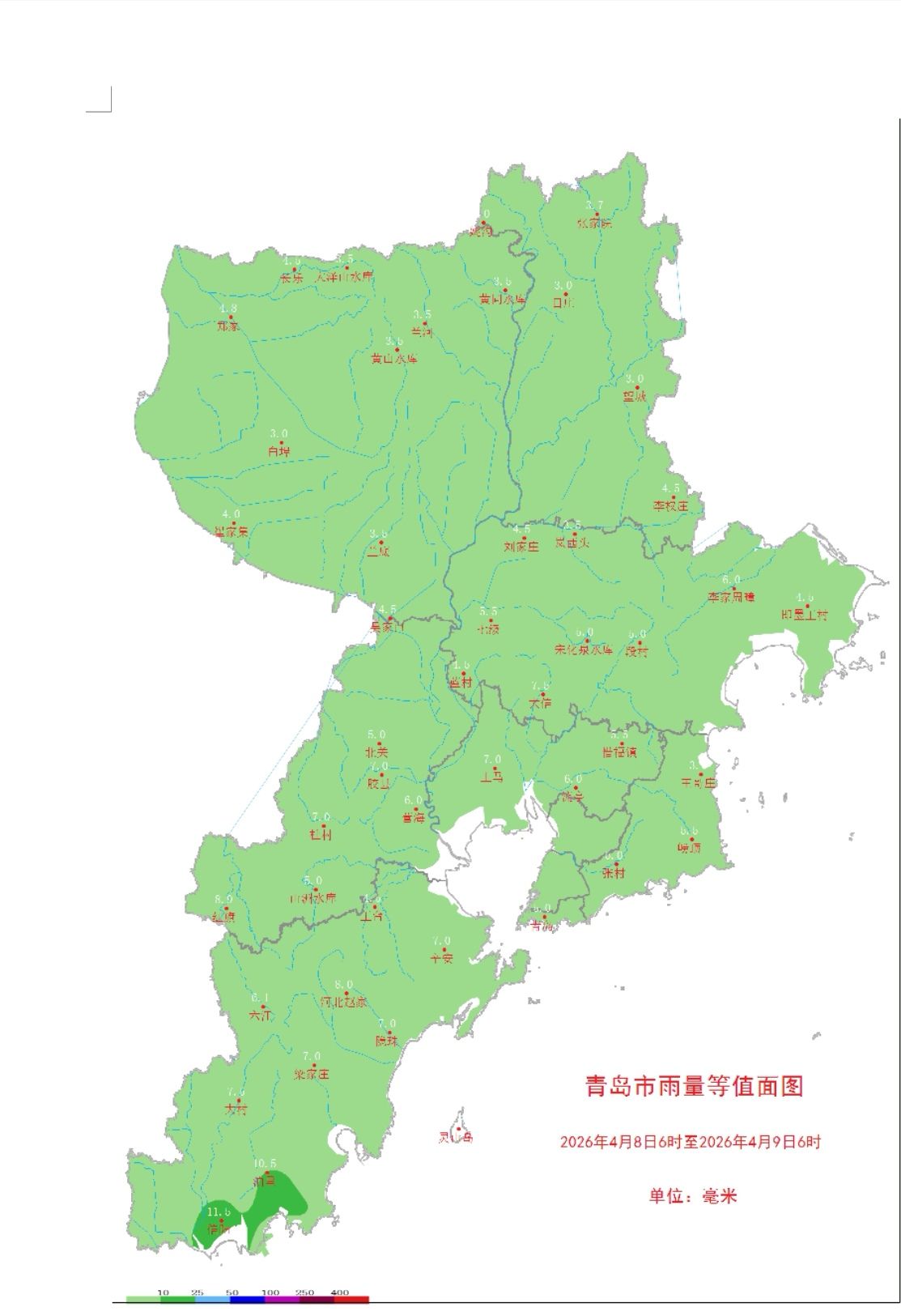 根据市水文局发布信息,4月8日6时至9日6时,全市平均降水量4.0mm,降水量排在前三位的站点是:西海岸新区信阳11.5mm,西海岸新区泊里10.5mm,西海岸新区东南崖10.5mm,最大1小时降水量为西海岸新区泊里6.0mm(4月9日02时-9日03时)。