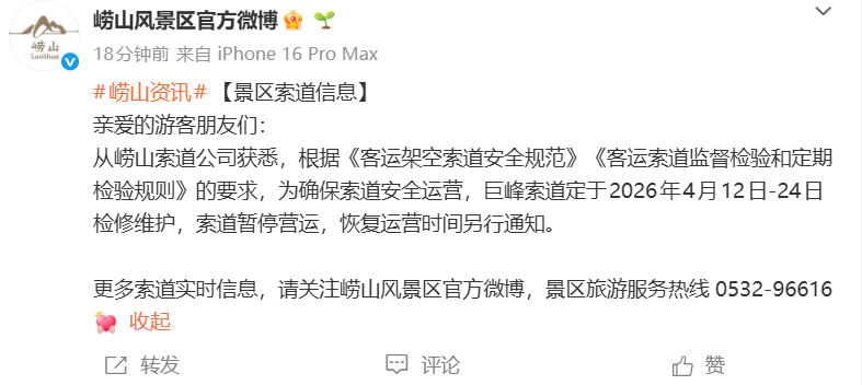 青岛日报社/观海新闻4月9日讯 观海新闻自@崂山风景区官方微博获悉,根据《客运架空索道安全规范》《客运索道监督检验和定期检验规则》的要求,为确保索道安全运营,巨峰索道定于2026年4月12日-24日检修维护,索道暂停营运,恢复运营时间另行通知。