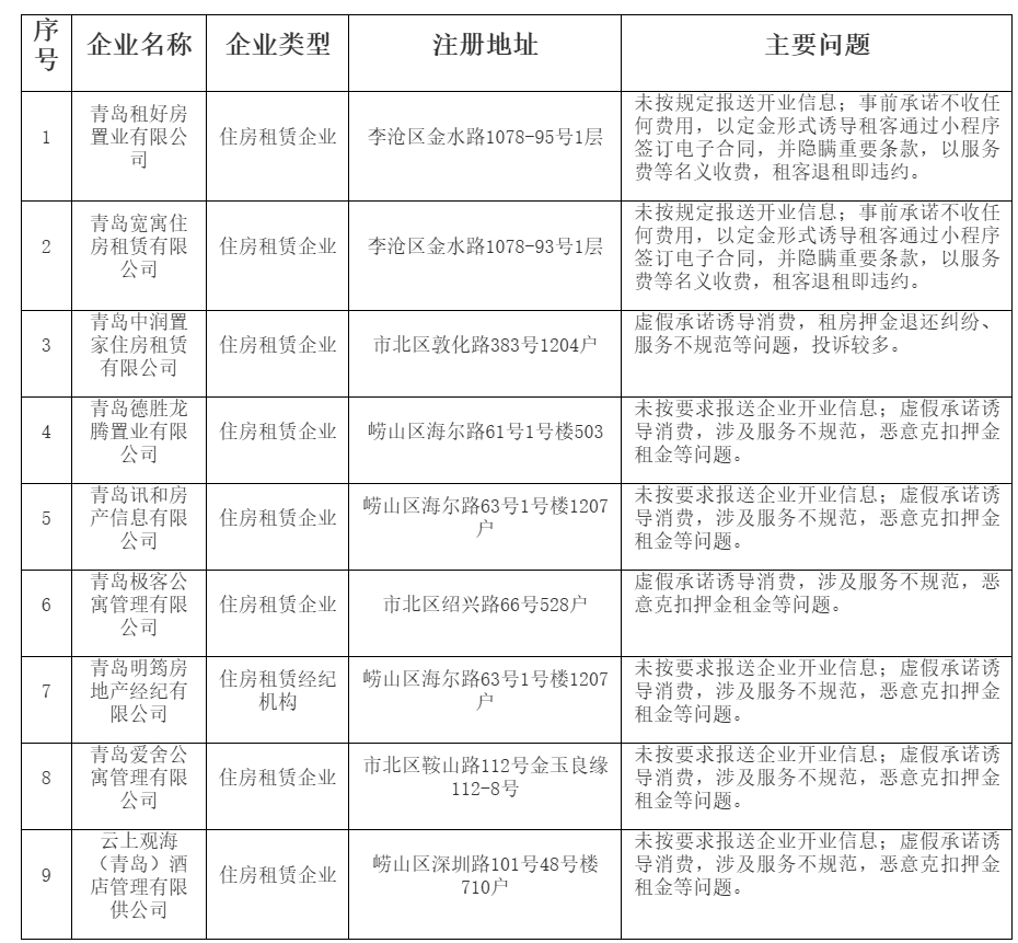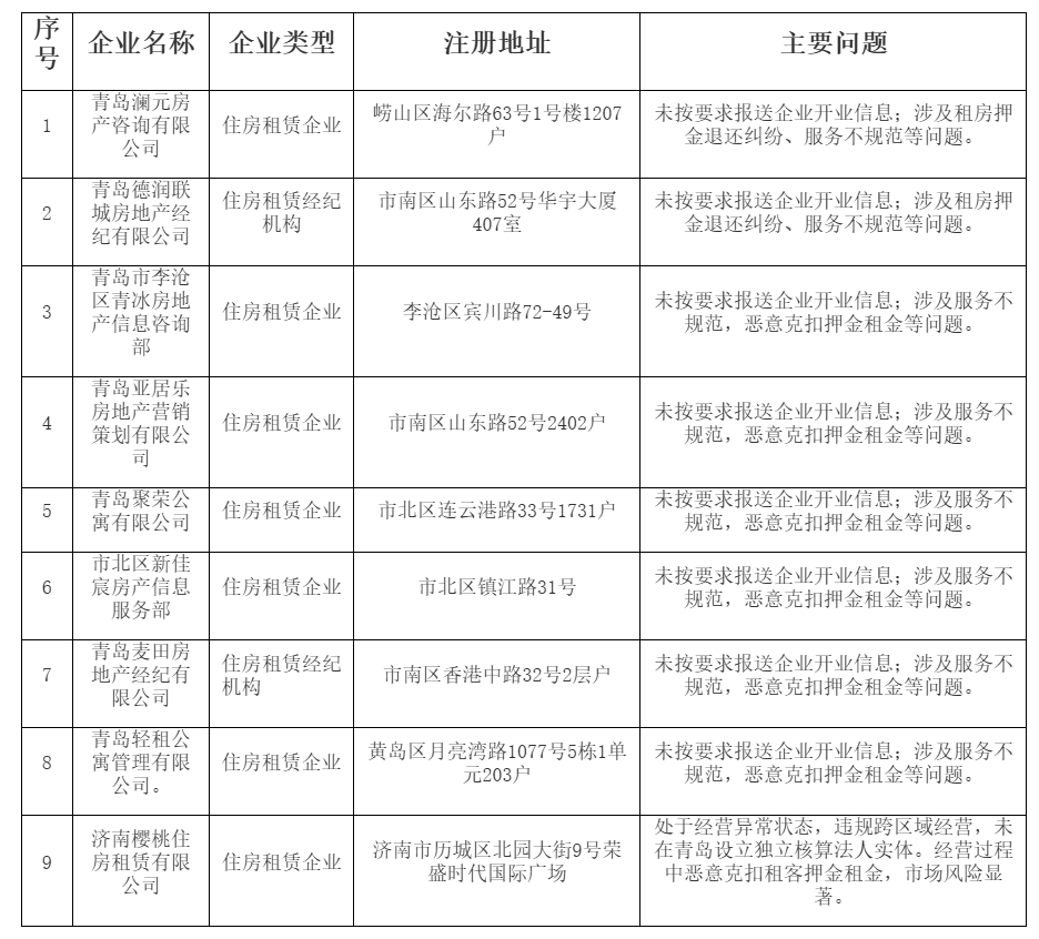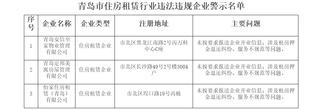 青岛市住房租赁行业违法违规企业警示名单