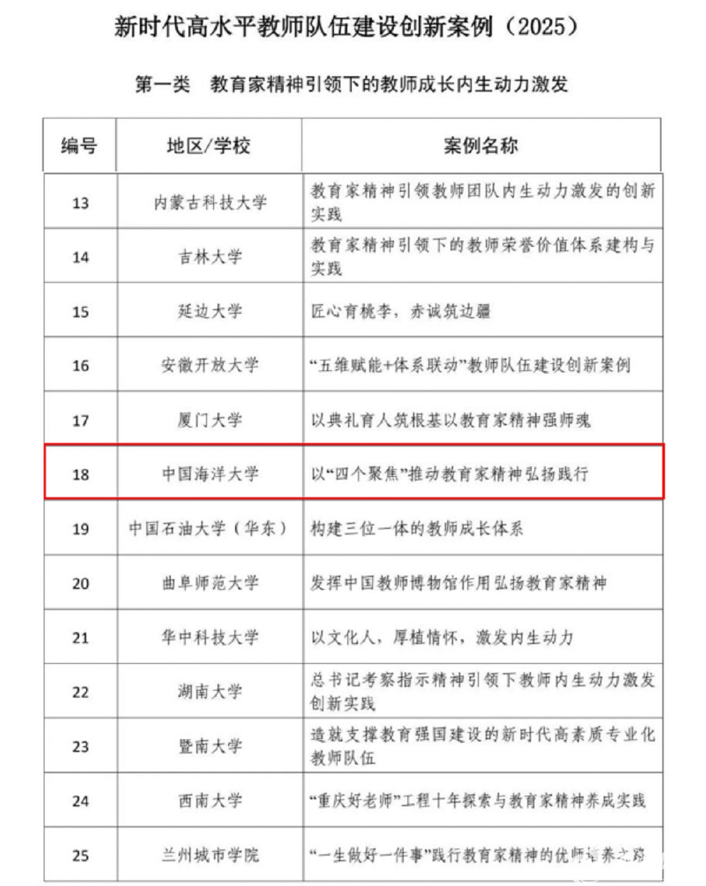 学校将继续坚持以教育家精神铸魂强师,深入实施蓝色梦想铸魂强师计划,努力建设一支师德高尚、业务精湛、结构合理、充满活力、潜心育人的新时代高素质专业化教师队伍,为建设特色显著的世界一流大学提供坚实支撑,为建设教育强国、海洋强国作出新的更大贡献。(青岛日报/观海新闻记者 杨琪琪)