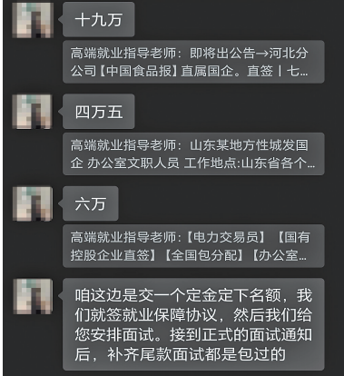 “办公室岗位,专业不限,全国可安排工作,就近入职”“大厂直签,长白双休,月薪过万,福利好”……一些中介公司、个人博主在社交平台上发布所谓的高薪招聘信息,声称可花钱获“保送”名额。有求职者反映,自己支付数万元服务费后,实际入职的企业、岗位、薪资等与对方承诺严重不符。