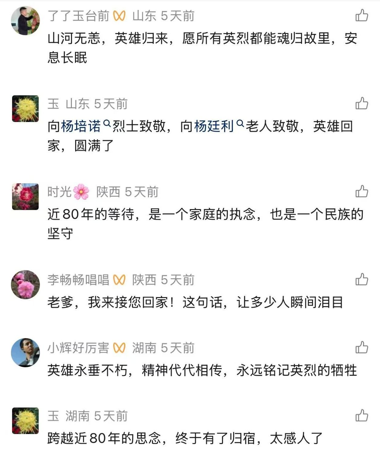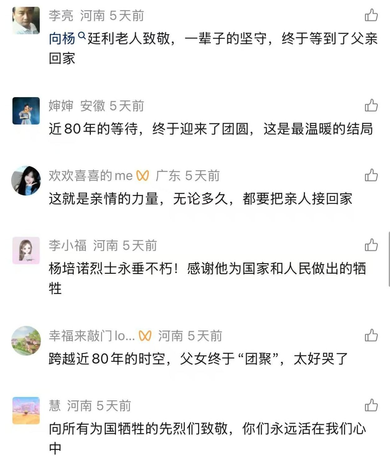 “跨越近80年的时空,父女终于‘团聚’,太好哭了”“这就是亲情的力量,无论多久,都要把亲人接回家”“老爹,我来接您回家!这句话,让多少人瞬间泪目”,网友们纷纷留言,被杨培诺烈士女儿时隔近80年“见到”父亲的场景深深触动,一句“老爹,我来接您回家”戳中无数人泪点,成为评论区高频提及的催泪瞬间。