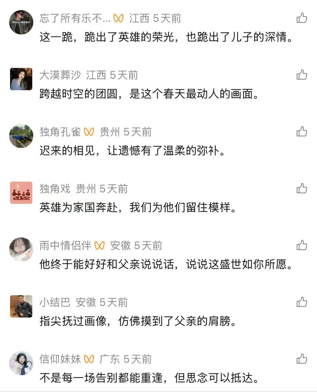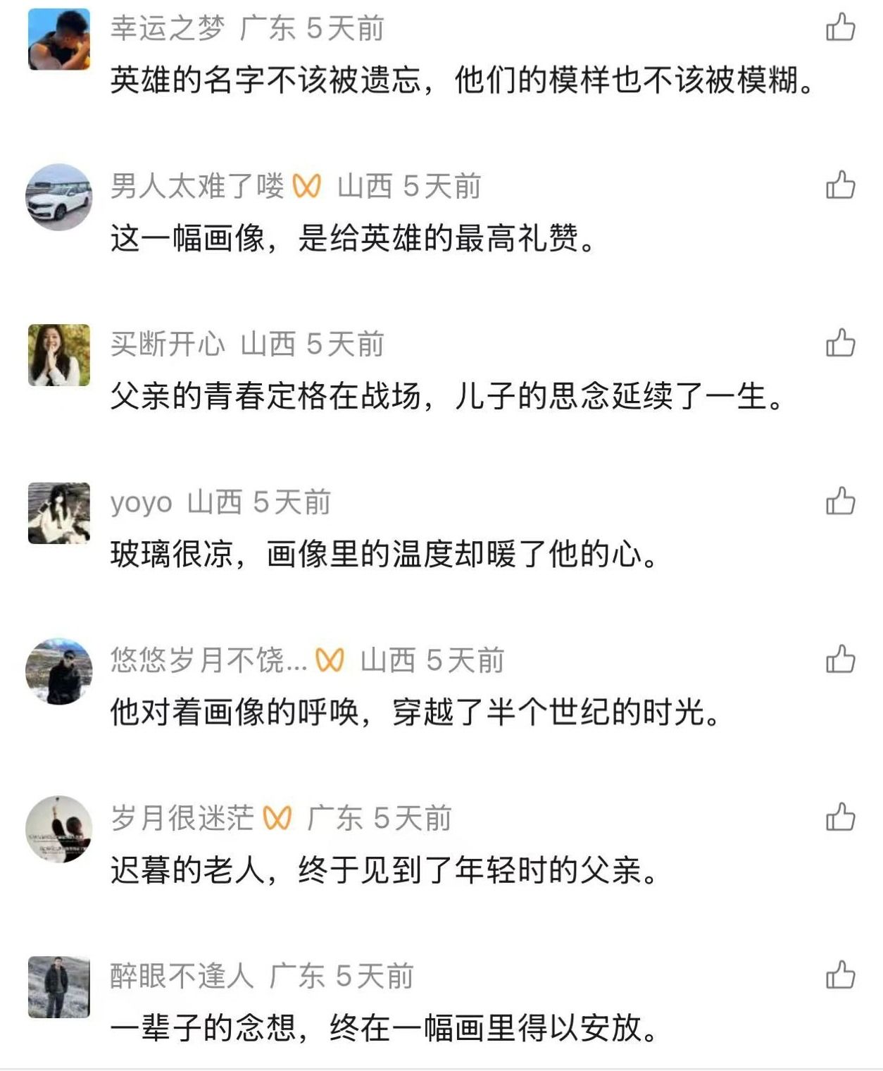 还有网友留言:“这一幅画像,是给英雄的最高礼赞!”“英雄的名字不该被遗忘,他们的模样也不该被模糊”“英雄为家国奔赴,我们为他们留住模样”……满屏正能量评论汇聚成暖流,大家在留言中传递追思、抒发信仰,纷纷表示要以英烈为榜样,传承红色基因,赓续精神血脉。