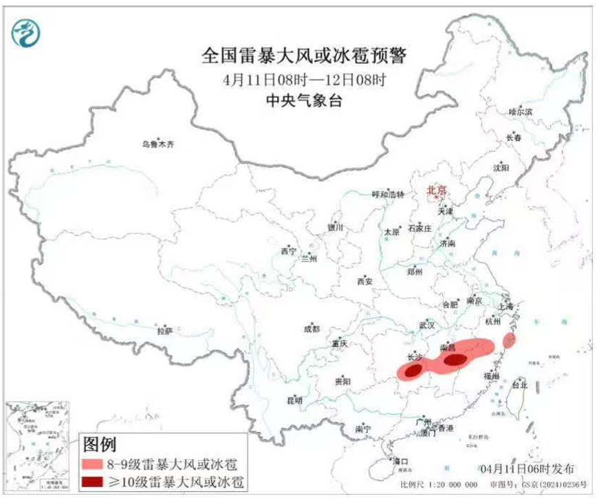 预计4月11日8时至12日8时,江南中部等地的部分地区将有8级以上雷暴大风或冰雹天气,其中,湖南南部、江西东部等地的部分地区将有10级以上雷暴大风,最大风力可达11级以上;江南中部等地的部分地区将有小时雨量大于20毫米的短时强降水天气,其中,湖南南部、江西中部等地的部分地区小时雨量大于50毫米。
