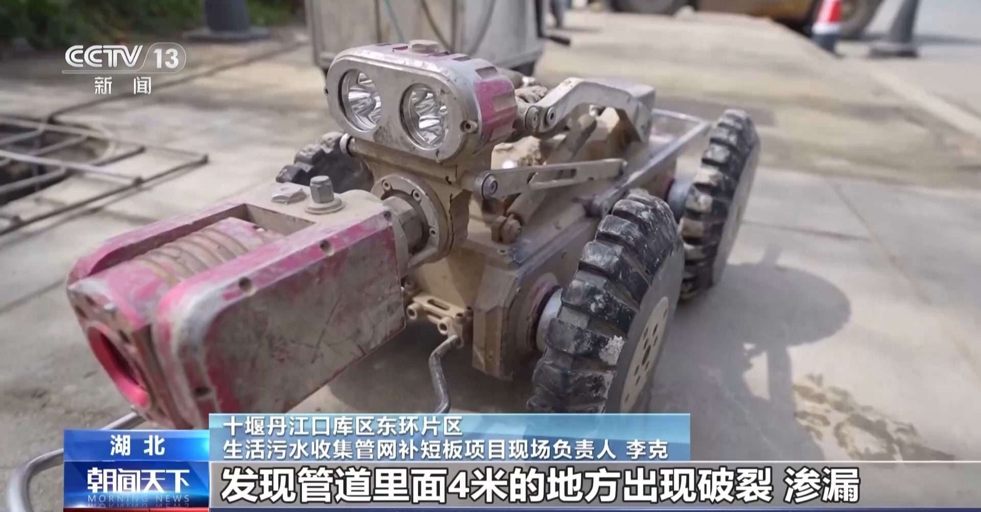 十堰丹江口库区东环片区生活污水收集管网补短板项目现场负责人 李克:刚才我们通过智能机器人检测,发现管道里面4米的地方出现破裂、渗漏,在27米的地方也是一个错口,大概有40厘米宽。