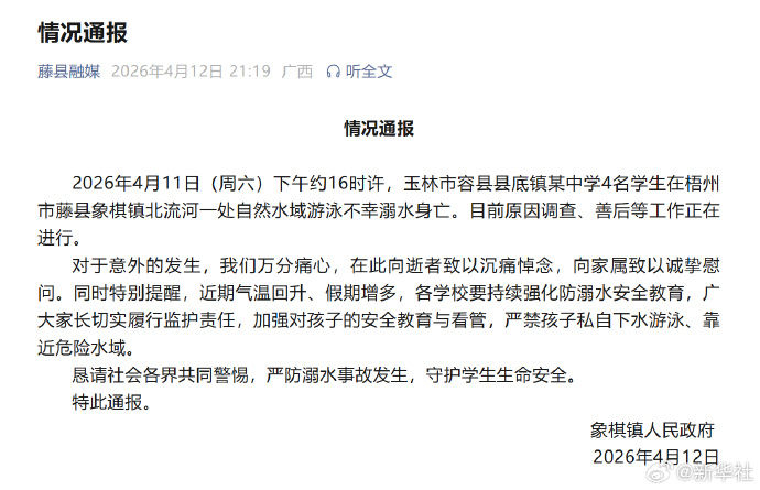 2026年4月11日(周六)约16时许,玉林市容县县底镇某中学4名学生在梧州市藤县象棋镇北流河一处自然水域游泳不幸溺水身亡。目前原因调查、善后等工作正在进行。对于意外的发生,我们万分痛心,在此向逝者致以沉痛悼念,向家属致以诚挚慰问。同时特别提醒,近期气温回升、假期增多,各学校要持续强化防溺水安全教育,广大家长切实履行监护责任,加强对孩子的安全教育与看管,严禁孩子私自下水游泳、靠近危险水域。恳请社会各界共同警惕,严防溺水事故发生,守护学生生命安全。(藤县融媒)