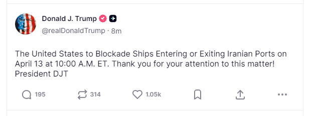 美东时间13日凌晨,美国总统特朗普在个人社交媒体平台上再次发声称,美国将于美国东部时间4月13日上午10时对进出伊朗港口的船只实施封锁。