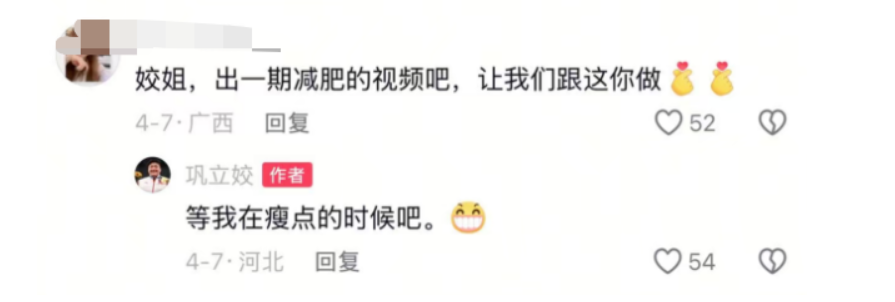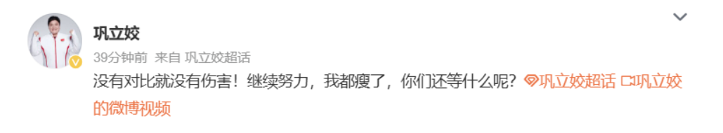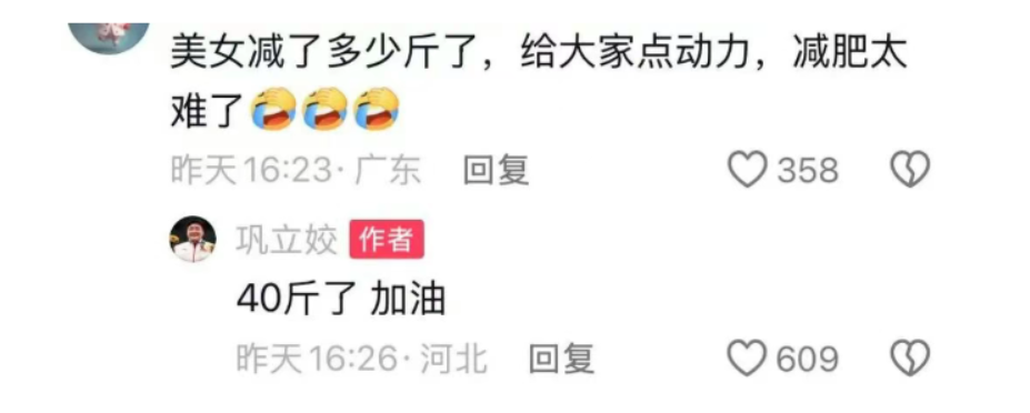 巩立姣在评论区回应称:已经瘦了40斤,加油!
