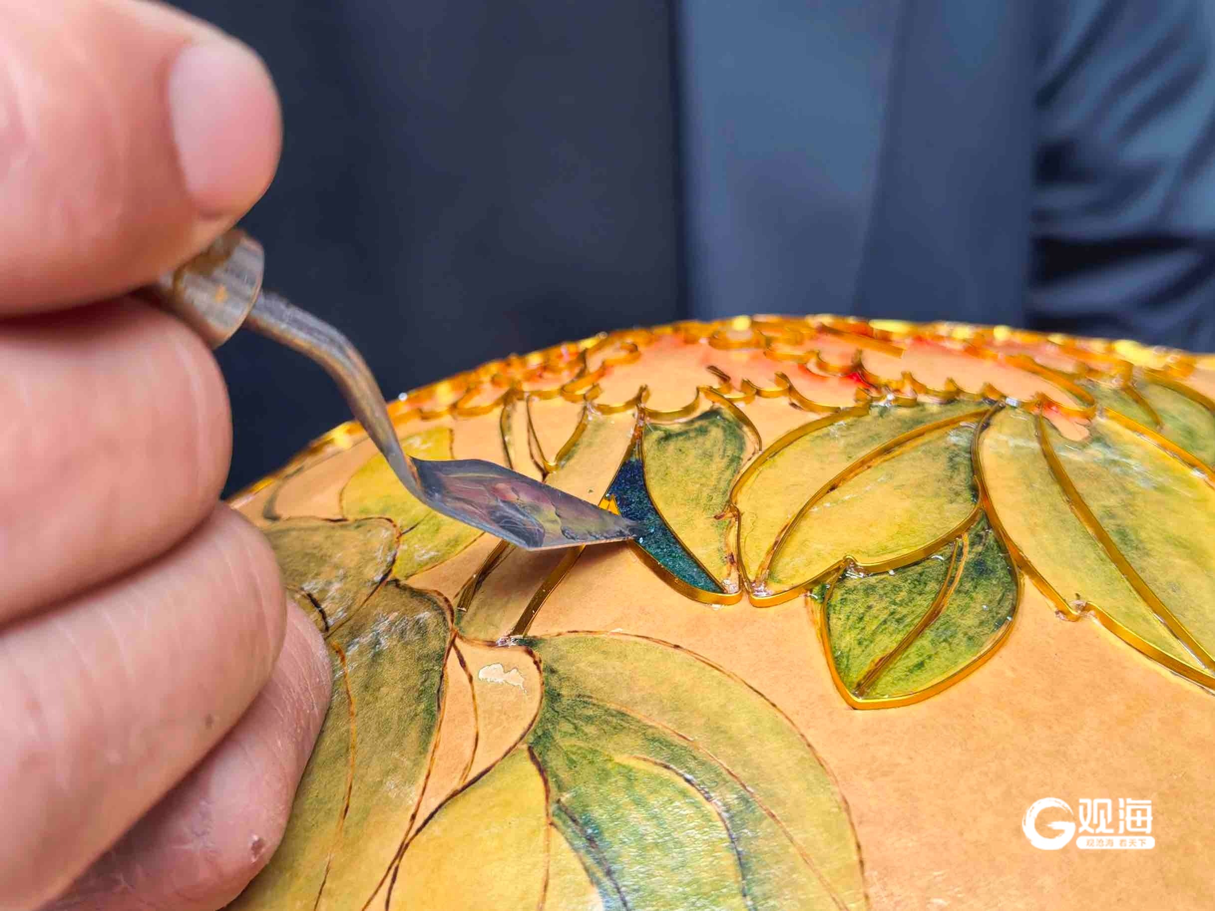掐丝工序完成后,便进入至关重要的点蓝环节。郑春辉小心翼翼取出提前精心调配的天然矿物釉料,这些釉料色泽纯正、质感温润,是保证作品质感的关键。他手持细巧的蓝枪,屏息凝神,一点点将釉料填入金属丝围成的轮廓之中。填色过程中,他时刻把控釉料厚度,既不能高出金属丝,也不能低于板面,避免出现溢料、漏料等问题。面对不同色彩的衔接区域,他耐心晕染、细致过渡,让色调层次分明、自然柔和,绝不出现生硬突兀的情况。