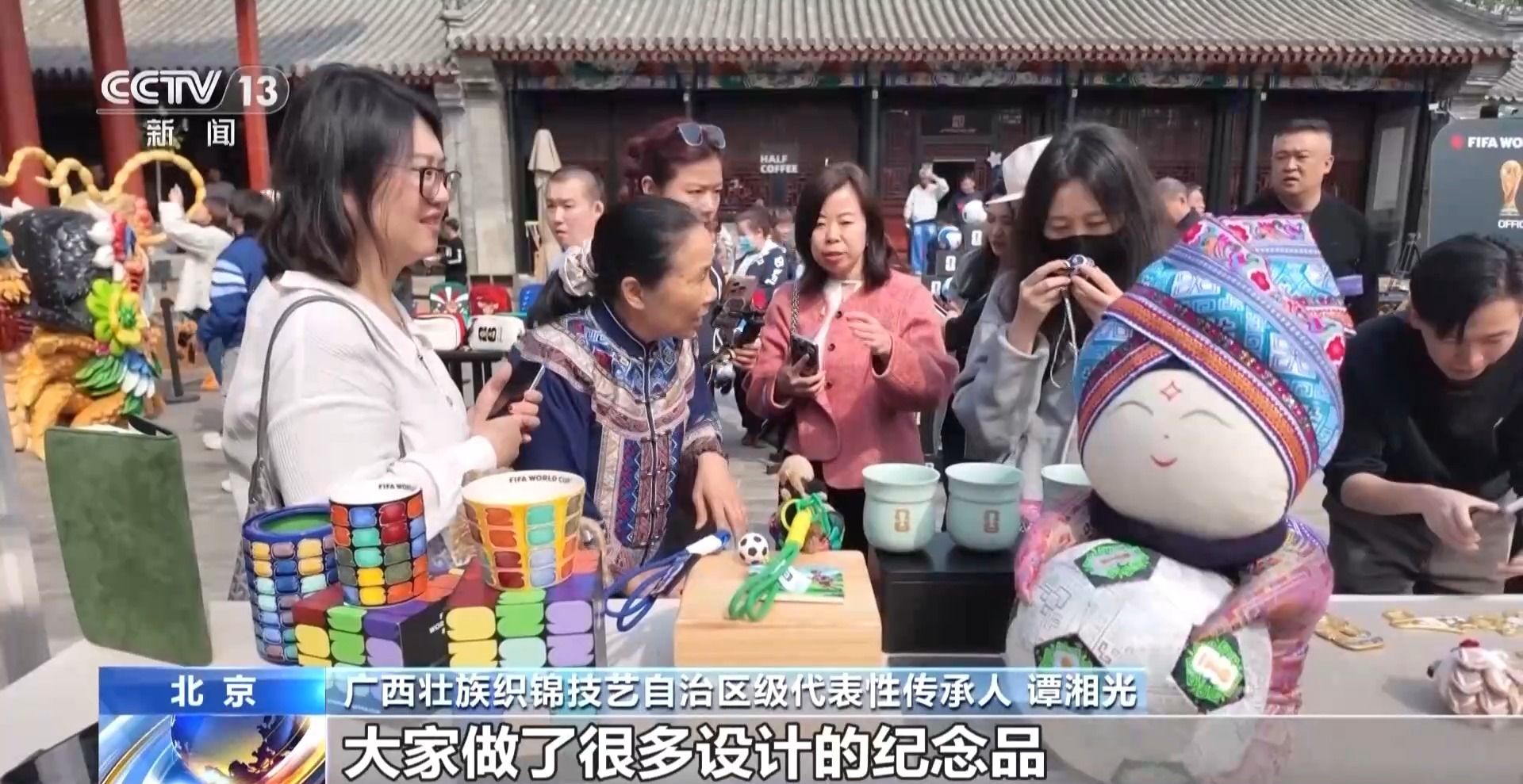 广西壮族织锦技艺自治区级代表性传承人 谭湘光:大家做了很多设计的纪念品。一个就是足球,我们用了彩色的手工织的壮锦,这里是用机器织的浅颜色的。