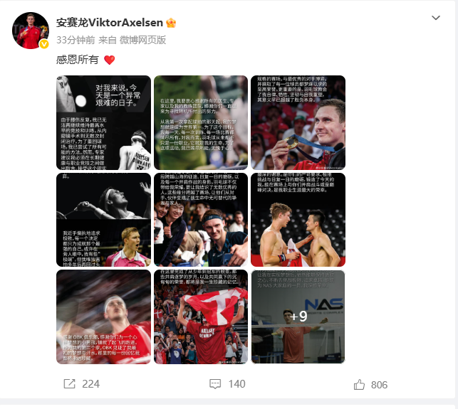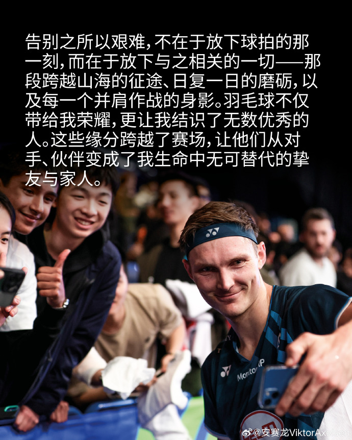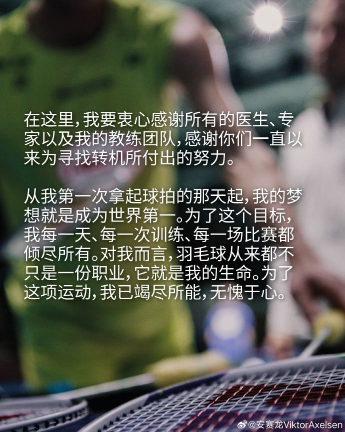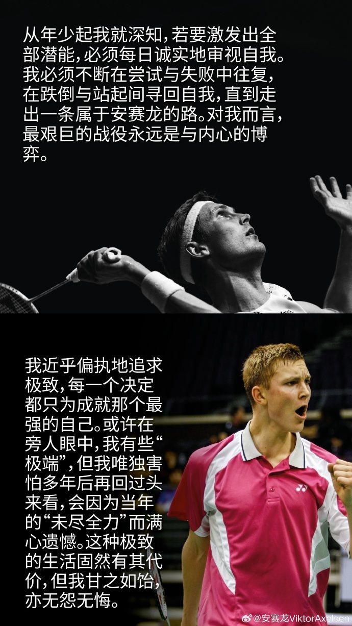 从我第一次拿起球拍的那天起,我的梦想就是成为世界第一。为了这个目标,我每一天、每一次训练、每一场比赛都倾尽所有。对我而言,羽毛球从来都不只是一份职业,它就是我的生命。为了这项运动,我已竭尽所能,无愧于心。”