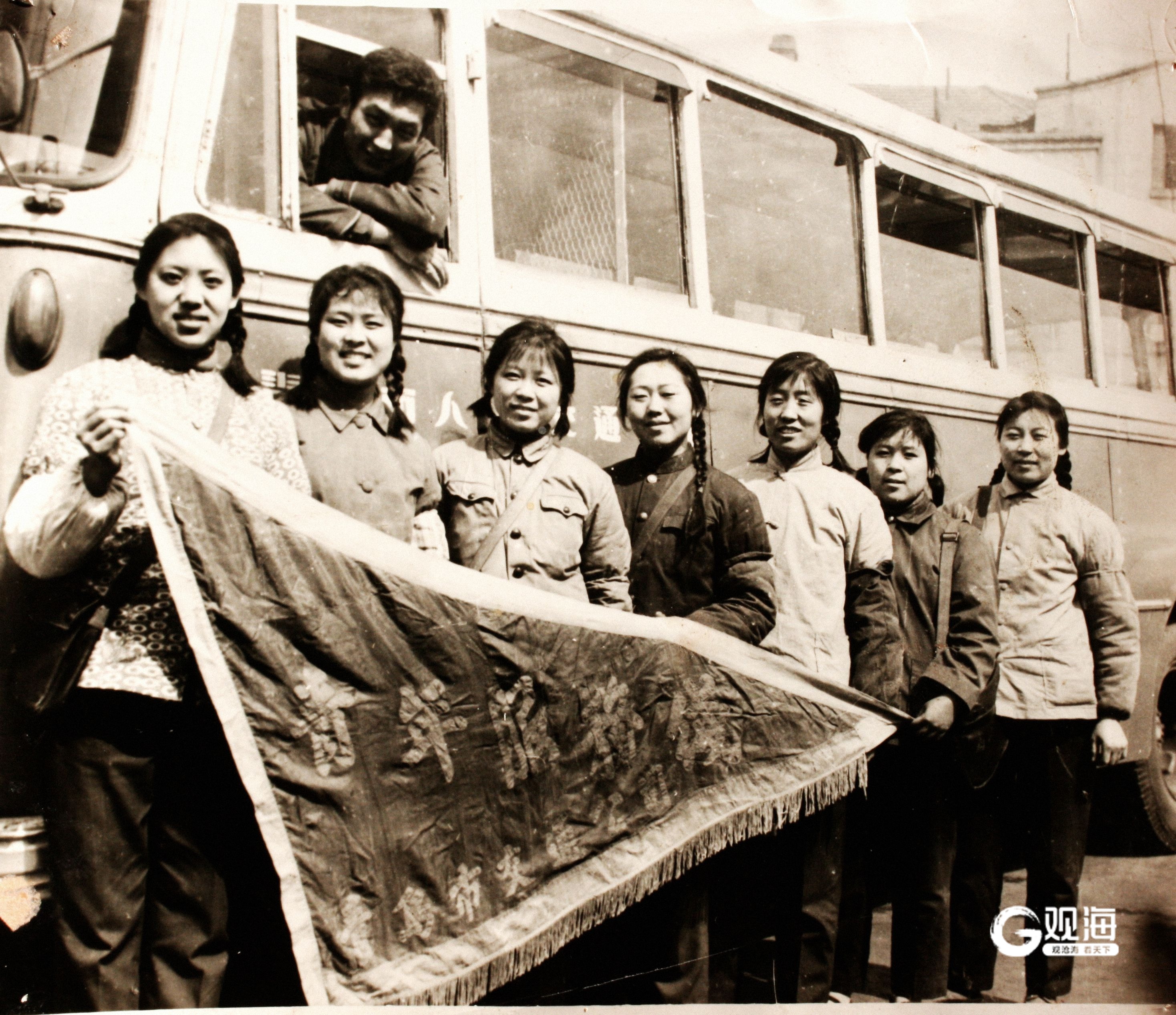 1978年,6路乘务员手持“青年服务线”线旗合影