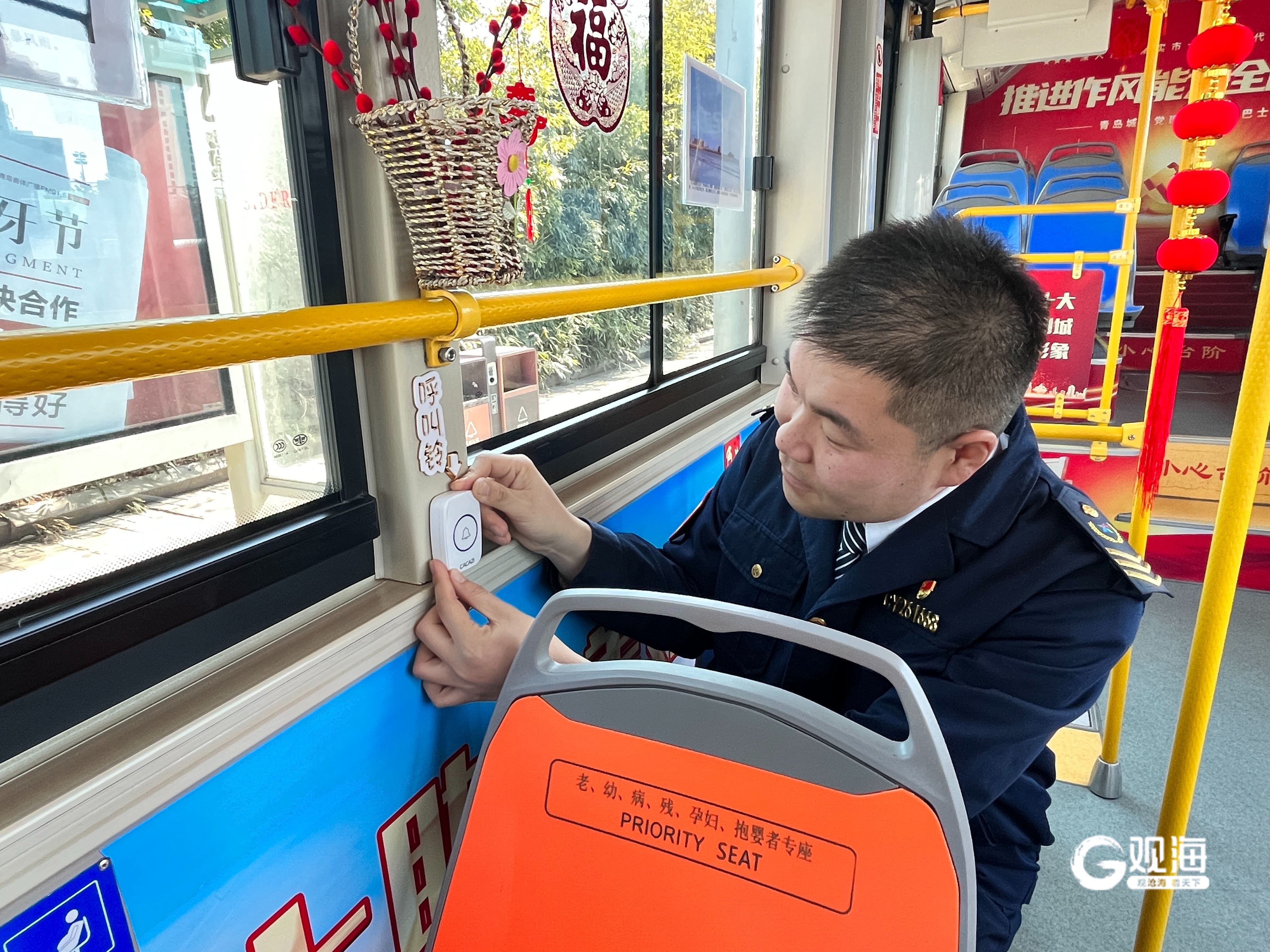 6路线驾驶员周群松在车厢内安装呼叫铃