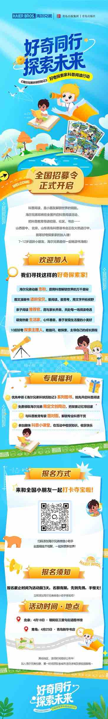 本次活动面向7-12岁青少年广发招募令,寻找心怀好奇、勇于探索的小小科普家。不管是海尔兄弟动画的忠实粉丝,渴望深入探索动画背后的科学知识;还是热爱图文漫画、乐于在文字中开拓视野的阅读小达人;亦或是愿意和家长携手参与亲子阅读、共享阅读时光的亲子阅读推荐官;或是心怀善意、善于发现生活美好,敢提问、敢探索的10后成长主理人,均可加入这场阅读奇遇。