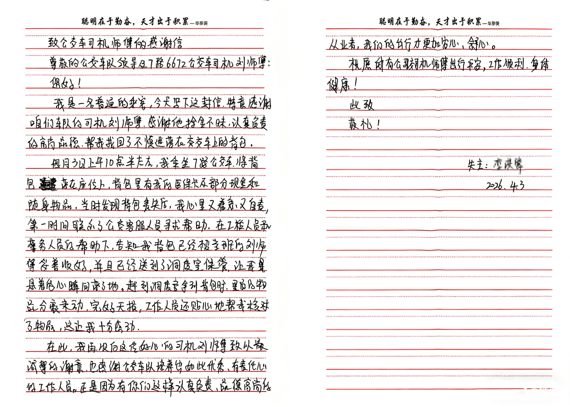 信中写道,李先生外出时不慎将装有医保凭证、现金及个人物品的背包遗落在公交座位上,发现遗失后万分焦急。他随即联系温馨巴士客服寻求帮助。幸运的是,当班驾驶员刘新春在运营途中发现失物后,严格遵照公司运营规范,第一时间将背包妥善保管并上交车队调度室封存。经工作人员细致核对,包内所有财物、证件完好无缺,顺利物归原主。