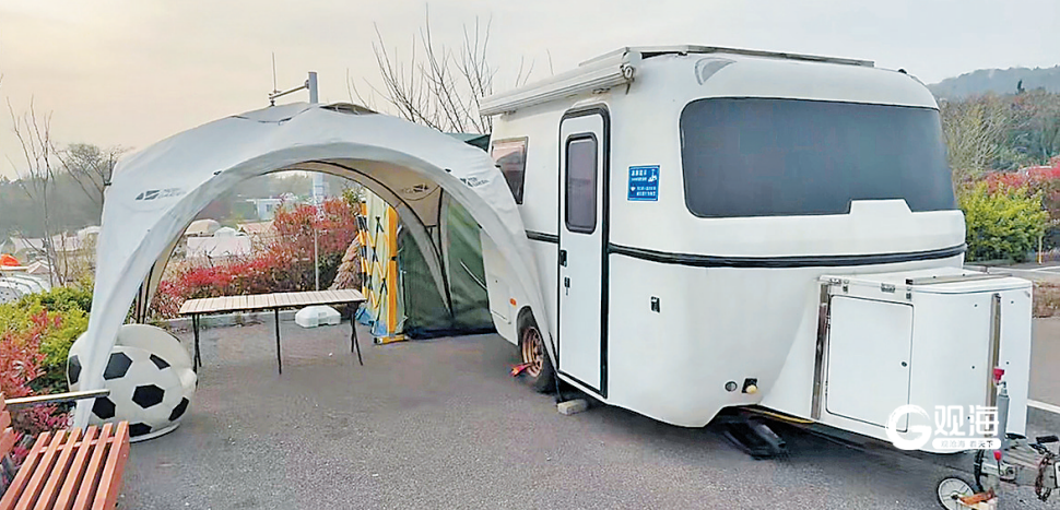 在凤凰山公园停车场中,一辆拖挂式房车旁支起两顶帐篷。