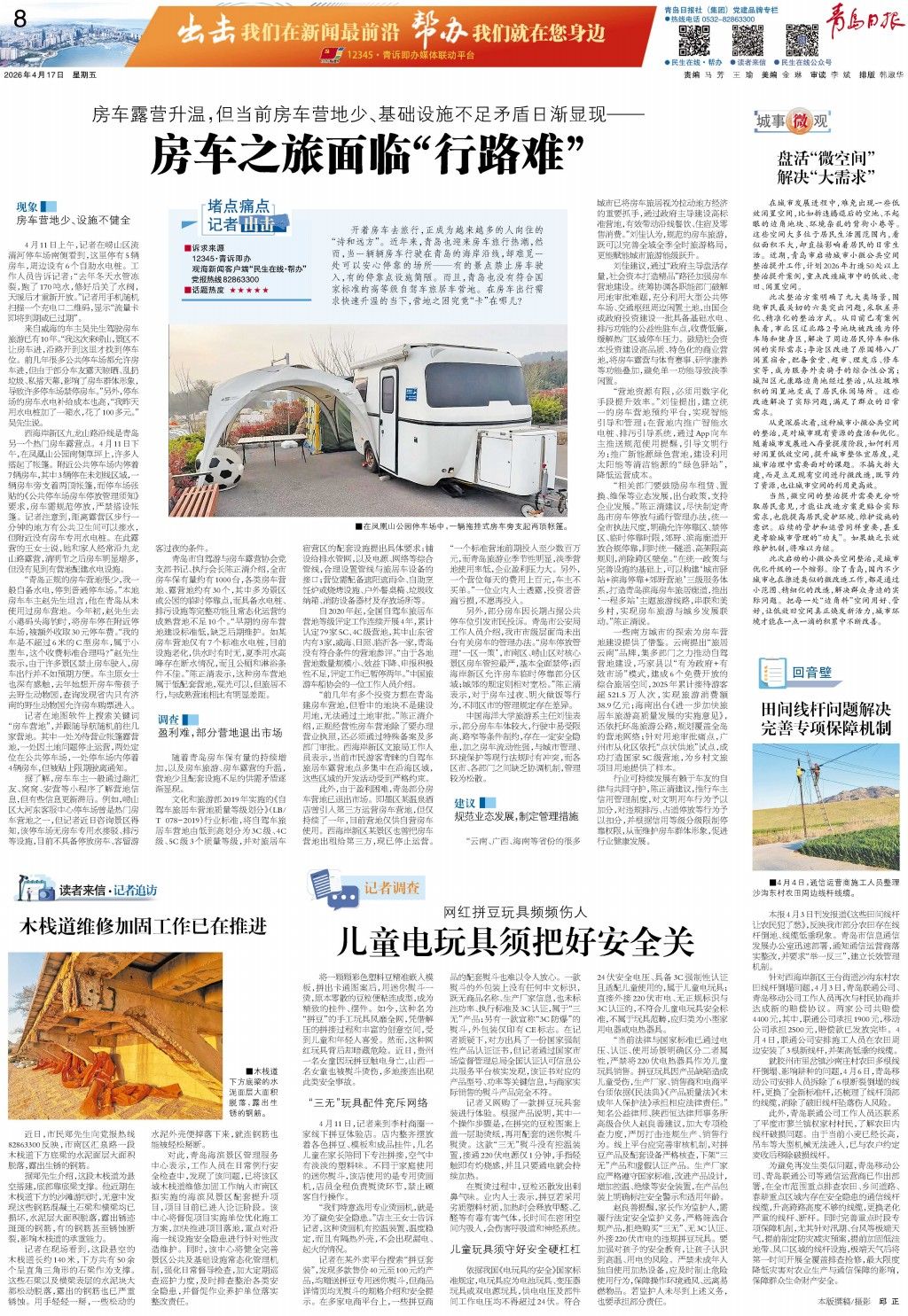 “相关部门要鼓励房车租赁、置换、维保等业态发展,出台政策,支持企业发展。”陈正清建议,尽快制定青岛市房车停放与通行管理办法,统一全市执法尺度,明确允许停靠区、禁停区、临时停靠时限,郊野、滨海廊道开放合规停靠,同时统一隧道、高架限高规则,消除跨区壁垒。“在统一政策与完善设施的基础上,可以构建‘城市驿站+滨海停靠+郊野营地’三级服务体系,打造青岛滨海房车旅居廊道,推出‘一程多站’主题旅游线路,串联和美乡村,实现房车旅游与城乡发展联动。”陈正清说。