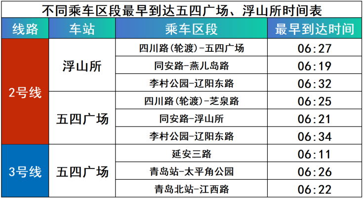 赛事当日,青岛地铁各线路运营时间与日常保持一致,不同乘车区段最早到达起点邻近车站(五四广场站、浮山所站)时间见下表,青岛地铁线网各站首车时间见文末。您也可通过青岛地铁APP、微信公众号和微博等途径获取线网各站详细首车时间,合理安排出行。
