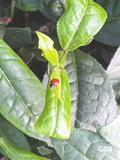 徐本权介绍,“茶园中不仅种茶树,还种碧桃树等。桃树叶片上的蚜虫成为天敌瓢虫的天然饵料,天敌瓢虫在此产卵孵化,成虫捕食范围辐射至周边茶园。现在是早春,茶叶上会有蚜虫萌发,此时天敌瓢虫正好‘大展拳脚’。不同季节,茶田有不同的昆虫,则有不同的天敌生物进行互补协作防治。茶园还引入岩垂草作为地被植物,其小花分泌蜜露,为多种昆虫提供栖息地和食物源,形成天敌生物的‘家园驿站’。”