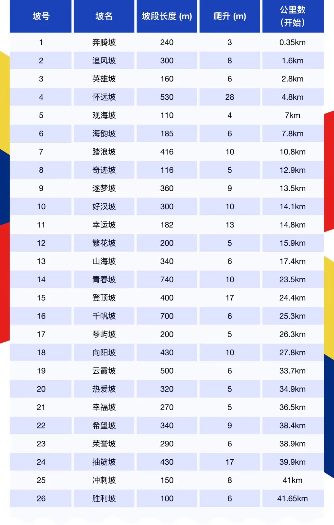 在官方发布的这张包括26个坡道的表格中,从0.35公里处的“奔腾坡”到41.65公里处的“胜利坡”,每个坡都有了自己的名字:追风、英雄、怀远、踏浪、好汉、抽筋……累计223米的爬升被拆解成26段起伏,最长的是23.5公里处740米的“青春坡”,最陡的是4.8公里处爬升28米的“怀远坡”。