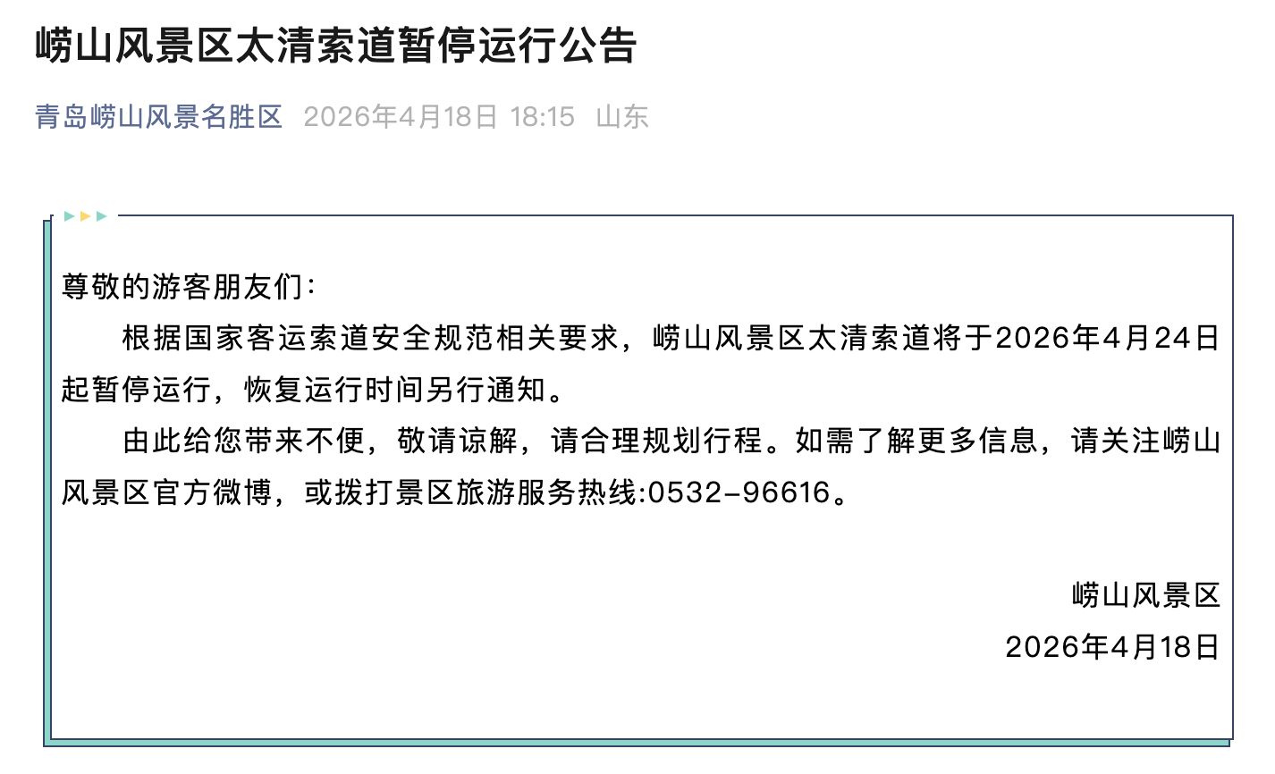 温馨提示:崂山风景区太清索道本月24日起暂停运行 2026-04-18 18:24 青岛日报社/观海新闻 0 青岛日报社/观海新闻4月18日讯 观海新闻从青岛崂山风景名胜区官方微信公众号获悉,崂山风景区太清索道将于2026年4月24日起暂停运行,恢复运行时间另行通知。 责任编辑:臧婷