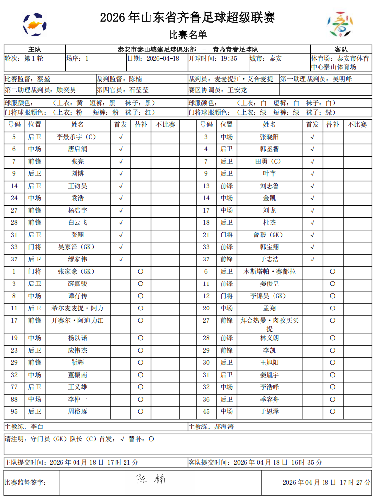 青岛队客战泰安队!齐鲁超赛揭幕战首发名单公布,麦麦提江担任主裁判 2026-04-18 18:49 青岛日报社/观海新闻 0 4月18日傍晚,2026年山东省齐鲁足球超级联赛揭幕战首发名单公布。 责任编辑:孙飞