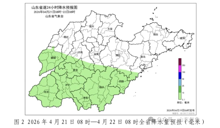 21日白天到夜间,泰安、聊城和鲁南地区天气晴转阴有小雨,其他地区天气晴转多云。南风,半岛地区4级阵风5~6级,其他地区3~4级。夜间最低气温:东营、淄博、潍坊和烟台北部13℃左右,其他地区10℃左右。最高气温:东营和潍坊25℃左右,菏泽、济宁、枣庄和聊城18℃左右,其他地区22℃左右。