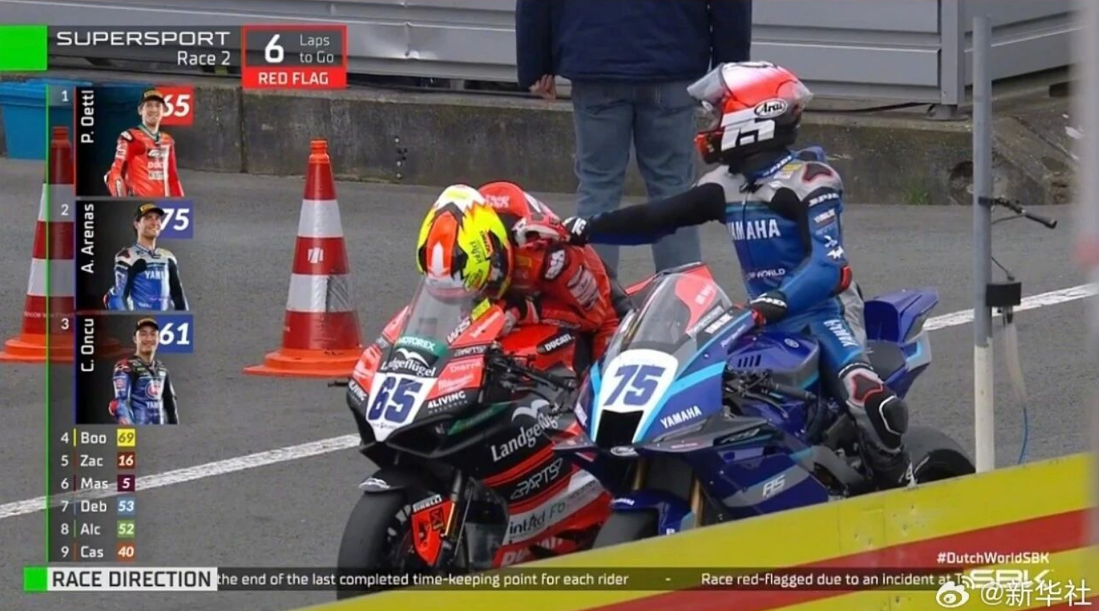 另据@人民日报 消息,WSBK荷兰站正赛第二回合遭遇雨战,在还剩6圈结束时,因有车手摔倒,赛会出示红旗,比赛提前结束。
