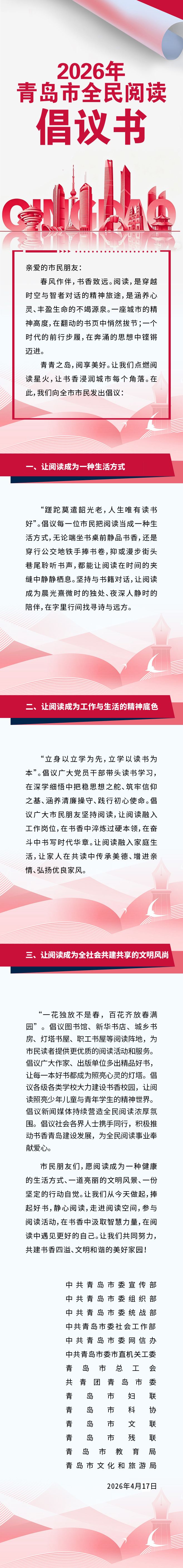 青岛日报社/观海新闻4月20日讯 4月20日至26日,全民阅读活动周暨2026青岛市书香海岸阅读季拉开帷幕。近日,市委宣传部联合市委组织部等多部门共同发布《2026年青岛市全民阅读倡议书》,号召市民将阅读融入日常生活,共建书香四溢、文明和谐的美好家园。
