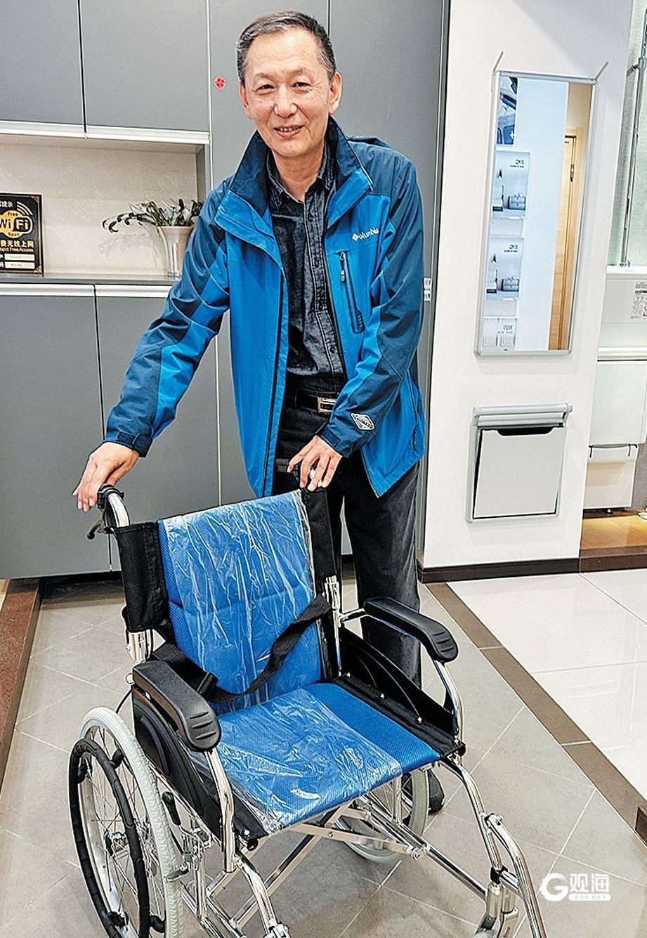 60岁的陈刚非常了解老年群体的真实需求。图为陈刚在店内展示适老轮椅。