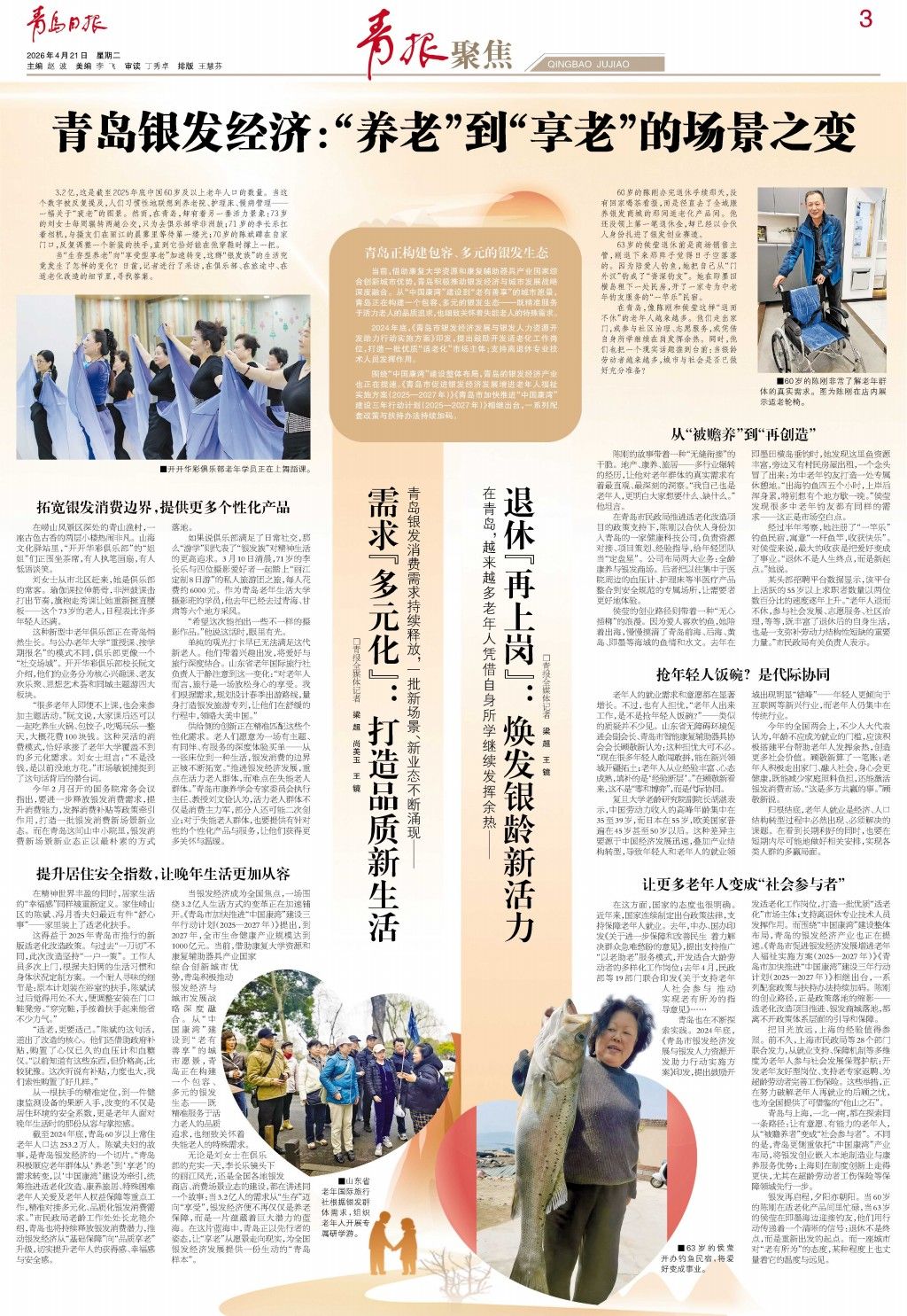 无论是刘女士在俱乐部的充实一天,李长乐镜头下的丽江风光,还是全国各地银发商店、消费场景业态的建设,都在讲述同一个故事:当3.2亿人的需求从“生存”迈向“享受”,银发经济便不再仅仅是养老保障,而是一片蕴藏着巨大潜力的蓝海。在这片蓝海中,青岛正以先行者的姿态,让“享老”从愿景走向现实,为全国银发经济发展提供一份生动的“青岛样本”。(青报全媒体记者 梁超 尚美玉 王镜)