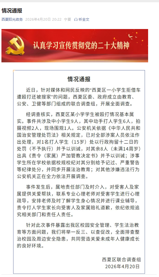 宁夏银川市西夏区通报学生拒绝“借”车遭殴打事件处置结果