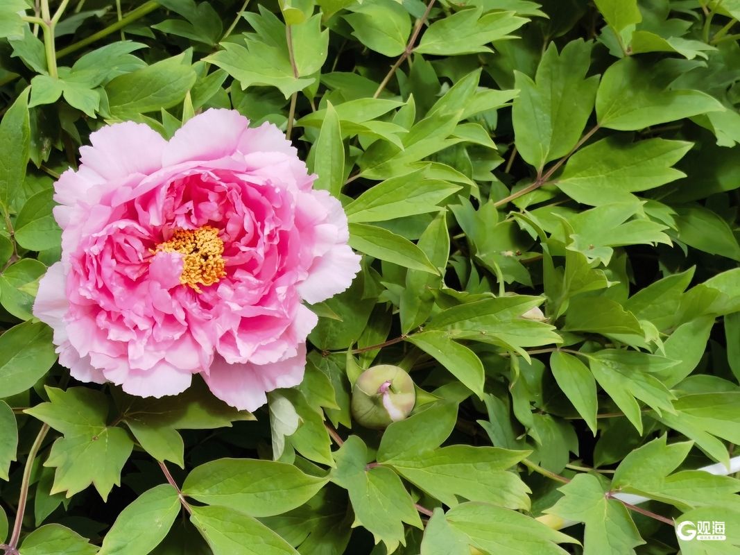 在索道广场,牡丹花开得最为热烈。那名为“嫦娥奔月”的品种,白底粉花,宛若仙子凌波;“西施浣纱”则花瓣舒展,轻盈柔美;更有“乌龙捧盛”,黑紫色的外层花瓣包裹着乳白的花心,尽显神秘与高贵。而在牡丹园深处,那座古朴的红色牡丹亭掩映在花海之中,红柱瓦顶与娇艳的花朵相映成趣,勾勒出一幅绝美的国风画卷。