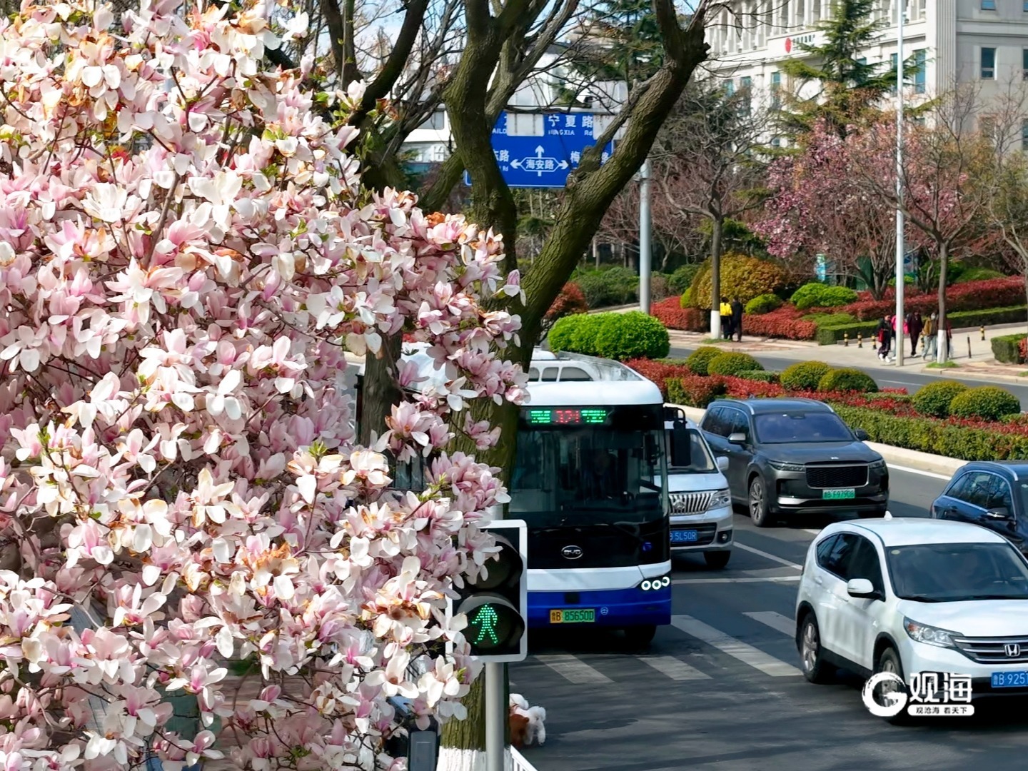 与海宁路相邻的海安路,则以清新淡雅的紫叶李著称。两条花路均从香港东路向南拐入,海宁路主打玉兰,海安路铺满紫叶李,花枝低垂,路尽见海。值得注意的是,目前正值玉兰花盛放期,花朵舒展、姿色动人,市民乘客可尽快前往观赏。