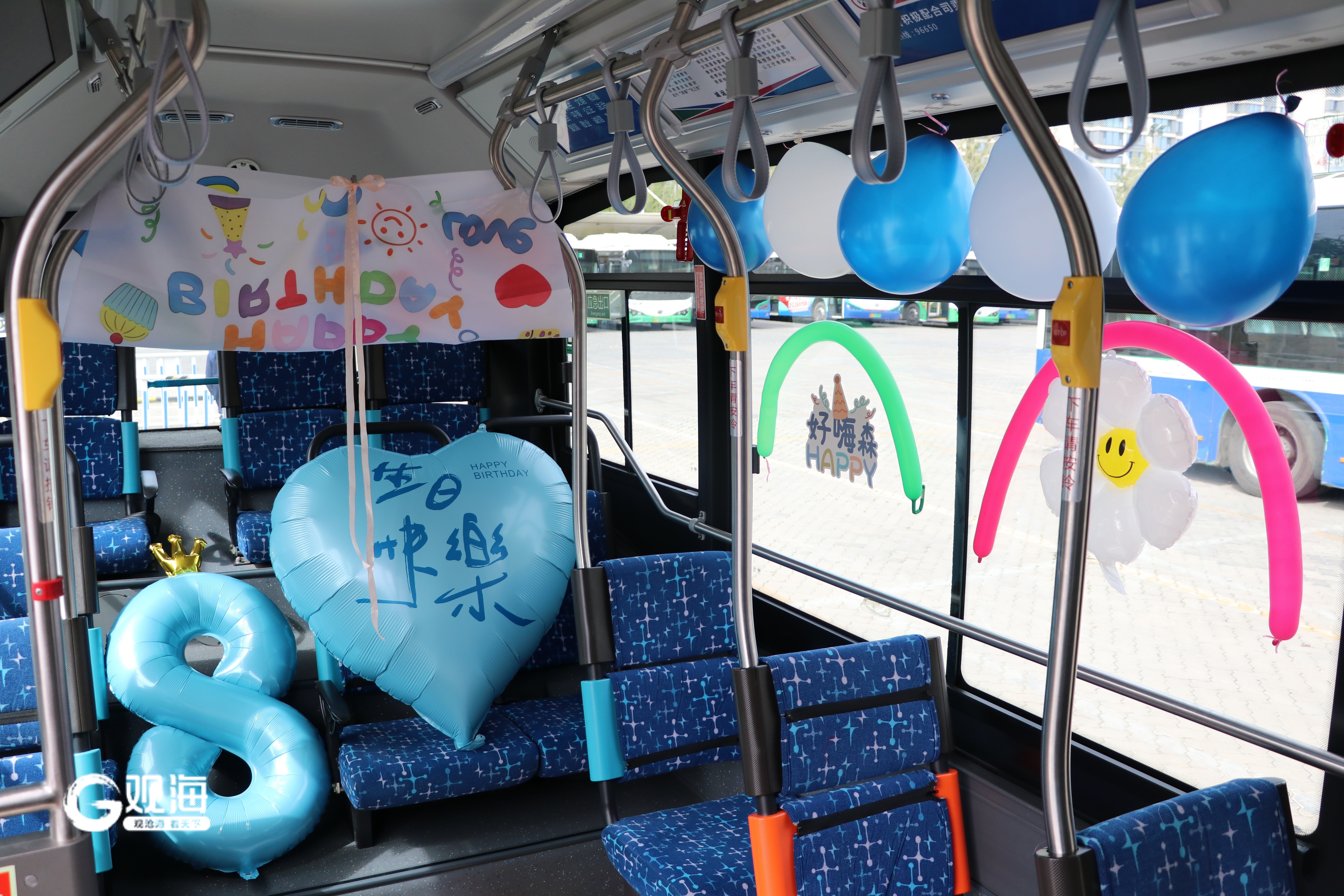 车厢内部更是惊喜连连:五彩气球、灵动拉花、温馨彩旗错落排布,扶手与座椅两侧放置了生日主题立牌,童趣盎然,营造出浓郁又治愈的生日氛围,让平日里承载市民出行的公交车,变身温馨治愈的生日派对现场。