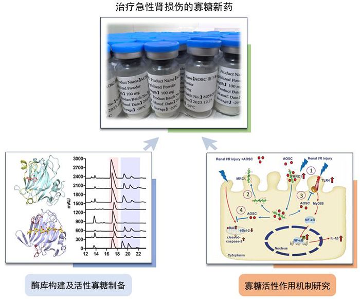 目前,团队已开发了多种具备成药潜力的海洋活性寡糖规模化酶法制备技术。同时,聚焦海洋寡糖药物研发过程中药效学靶点不清楚的难题,联合中山大学王蔚东、李春凌教授团队,在多个水平开展了寡糖活性及机制研究。研究证实该海洋寡糖可通过抑制炎症反应、减轻肾小管上皮细胞损伤,有效改善缺血再灌注、脓毒症及药物毒性诱导的急性肾损伤,保护肾功能并延缓其向慢性肾脏病进展。这为创新药物的研发奠定了扎实的药效学基础。相关成果发表在《国际生物大分子杂志》《中国药理学报》等领域内高水平期刊,获国家授权发明专利多项(ZL201710008519.8,ZL201710430426.4等)。