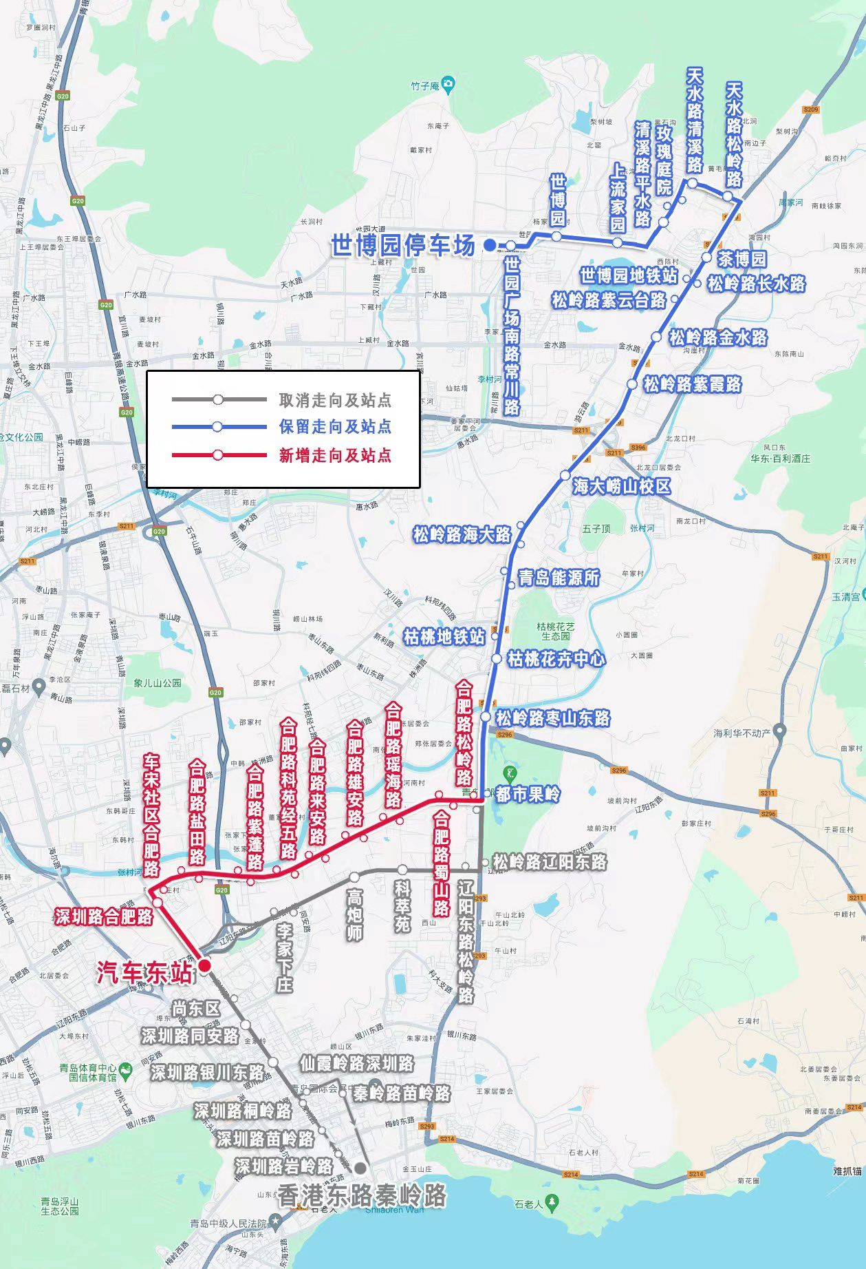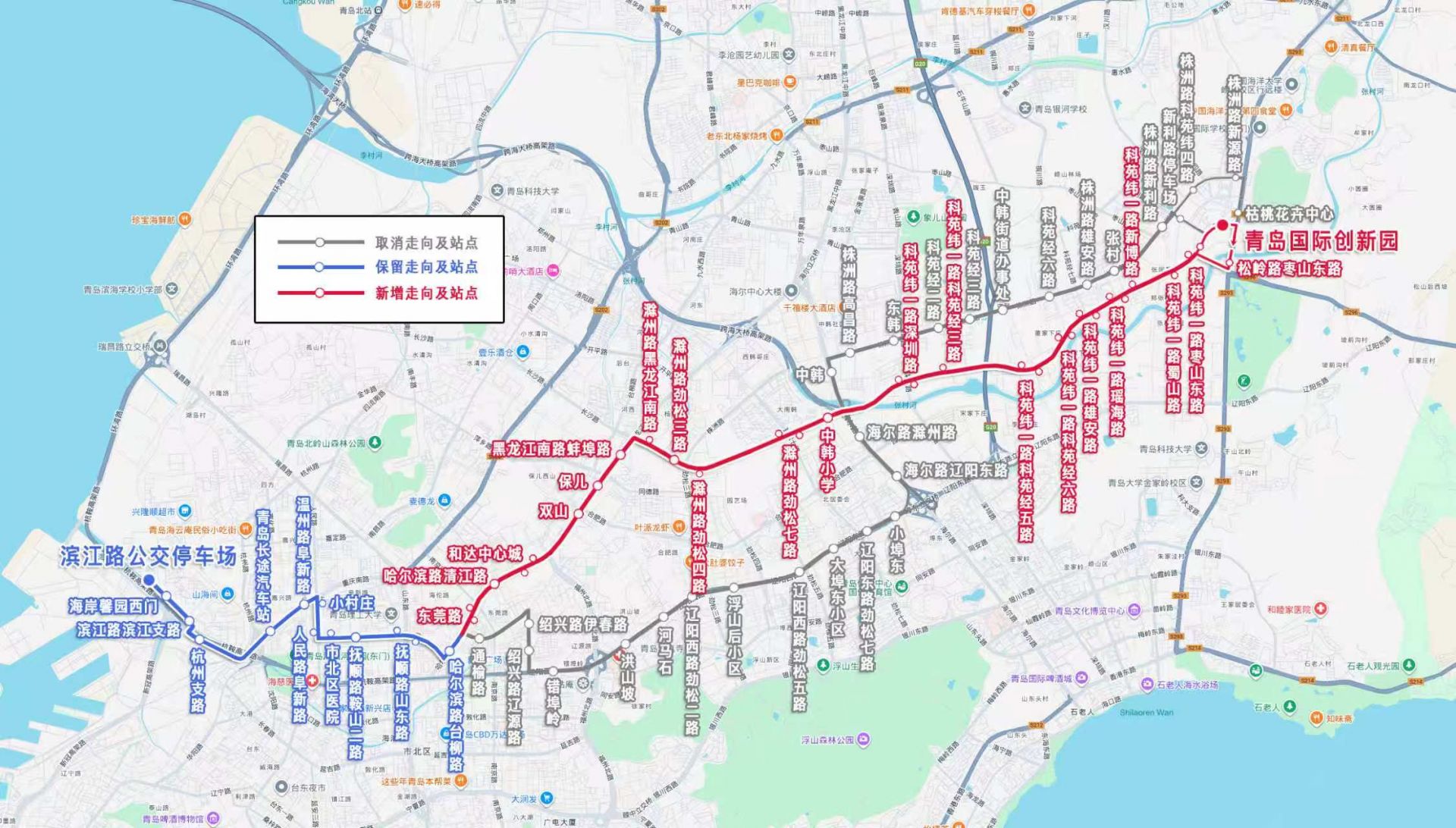 主站滨江路公交停车场,副站由株洲路新源路调整为青岛国际创新园,调整后为:滨江路公交停车场—青岛国际创新园。
