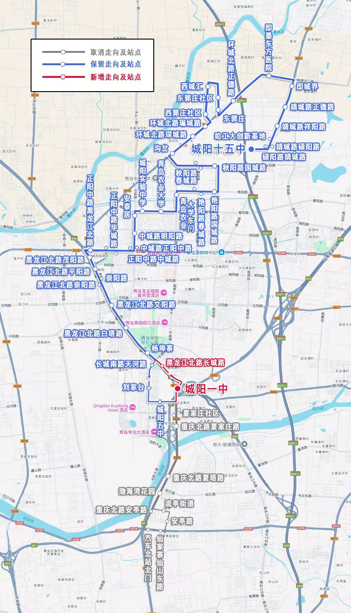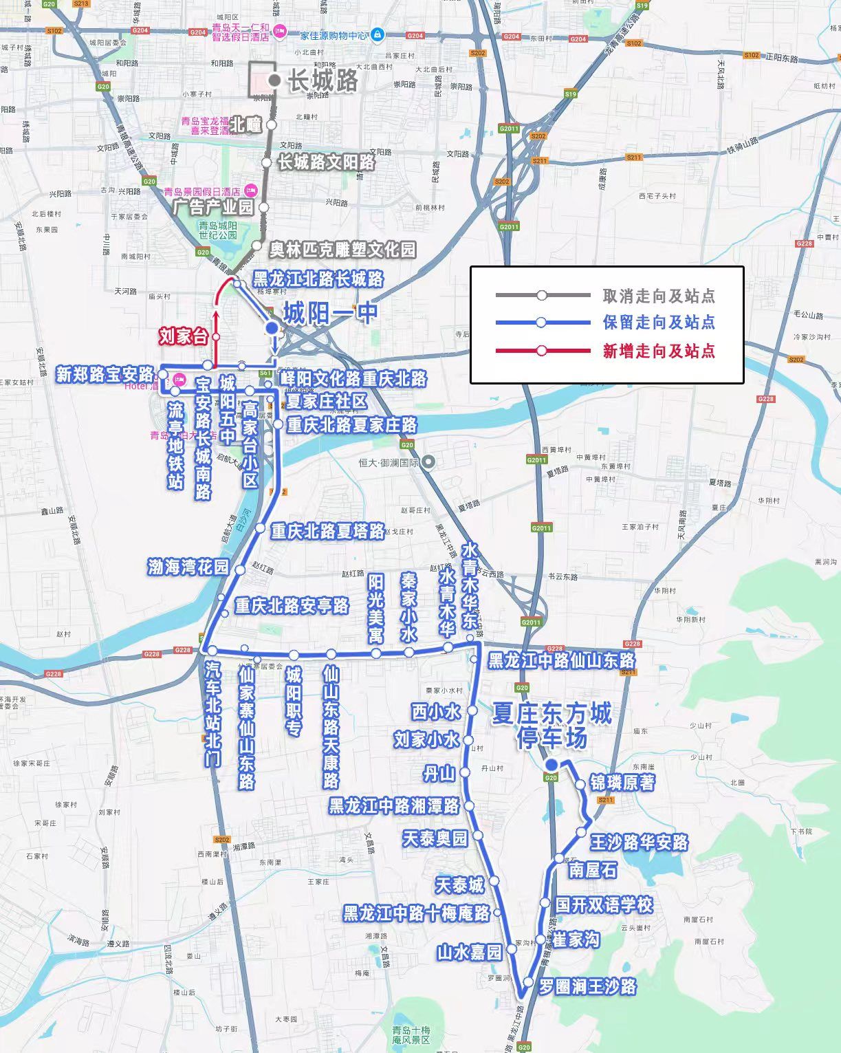 取消站:城阳五中(仅下行)、城阳一中(仅下行)、黑龙江北路长城路(原下行)、奥林匹克雕塑文化园(双向)、广告产业园(双向)、长城路文阳路(双向)、北疃(双向)、长城路(上下客站)。