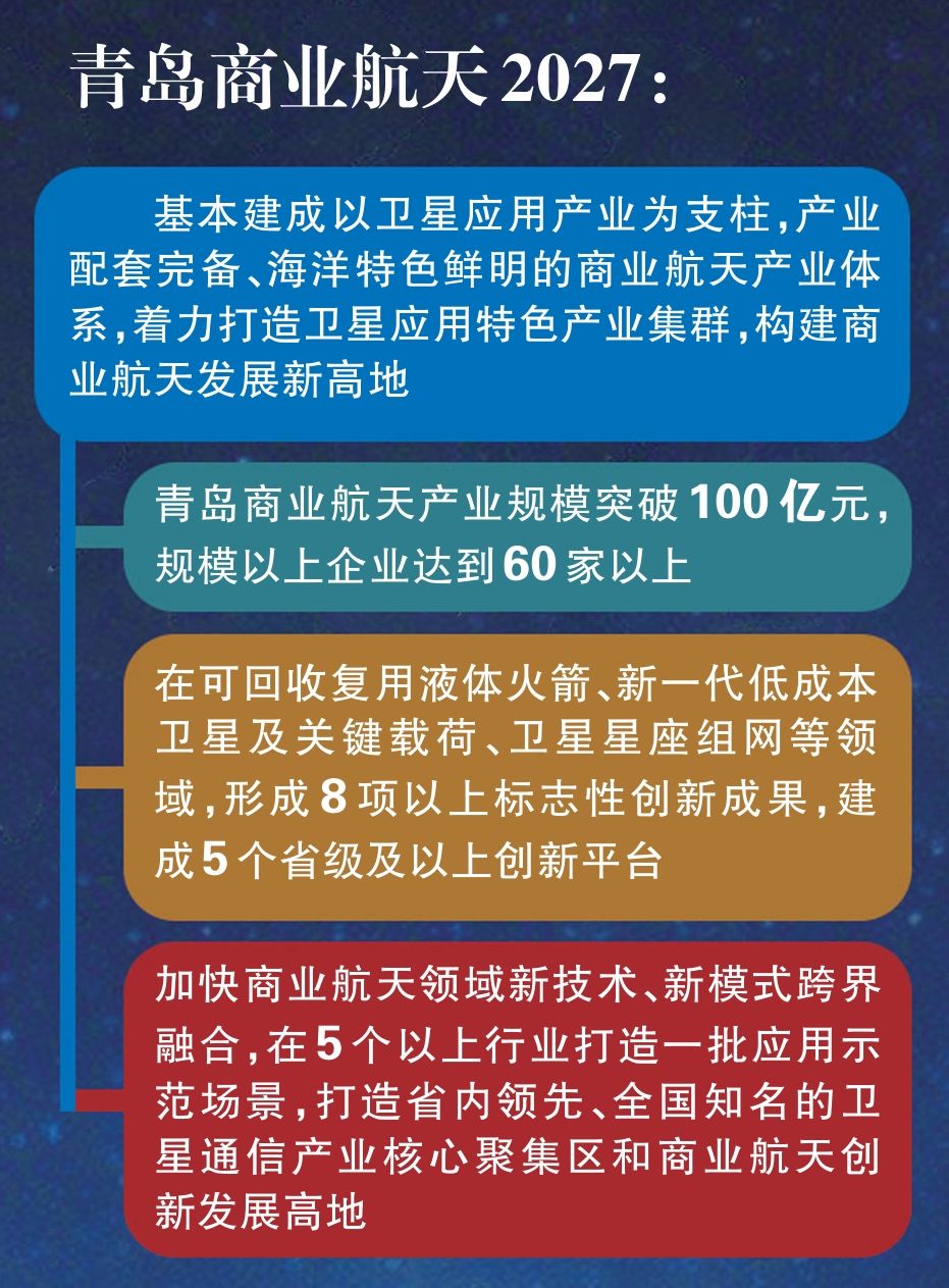 到2027年,青岛将在可回收复用液体火箭、新一代低成本卫星及关键载荷、卫星星座组网等领域,形成8项以上标志性创新成果,建成5个省级及以上创新平台;加快商业航天领域新技术、新模式跨界融合,将在5个以上行业打造一批应用示范场景,打造省内领先、全国知名的卫星通信产业核心聚集区和商业航天创新发展高地。