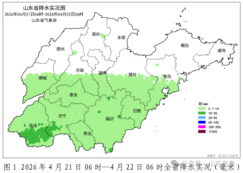 4月21日06时至22日06时,全省共有13市、82县(市、区)、1028乡镇出现降水,平均降水量2.8(毫米,下同),折合水量约4.4亿方。各市平均:菏泽8.7、济宁6.8、临沂6.2、日照5.0、枣庄4.7、泰安4.5、淄博1.4、潍坊1.4、聊城1.3和济南1.2,其他市降水量不足1.0或无降水。县(市、区)平均降水量超过10.0的3个,5.0—10.0的34个,1.0—5.0的26个,前3位的是:菏泽曹县12.2、菏泽成武县11.9和济宁金乡县11.0。所有站点降水量超过10.0的167个,5.0—10.0的1032个,1.0—5.0的790个,前3位的是:菏泽曹县楼庄(气象站)17.4、菏泽曹县阎店楼(气象站)17.3和菏泽曹县古营集(气象站)17.1。今年以来全省平均降水量65.6,较常年同期偏多8.9(16%)。