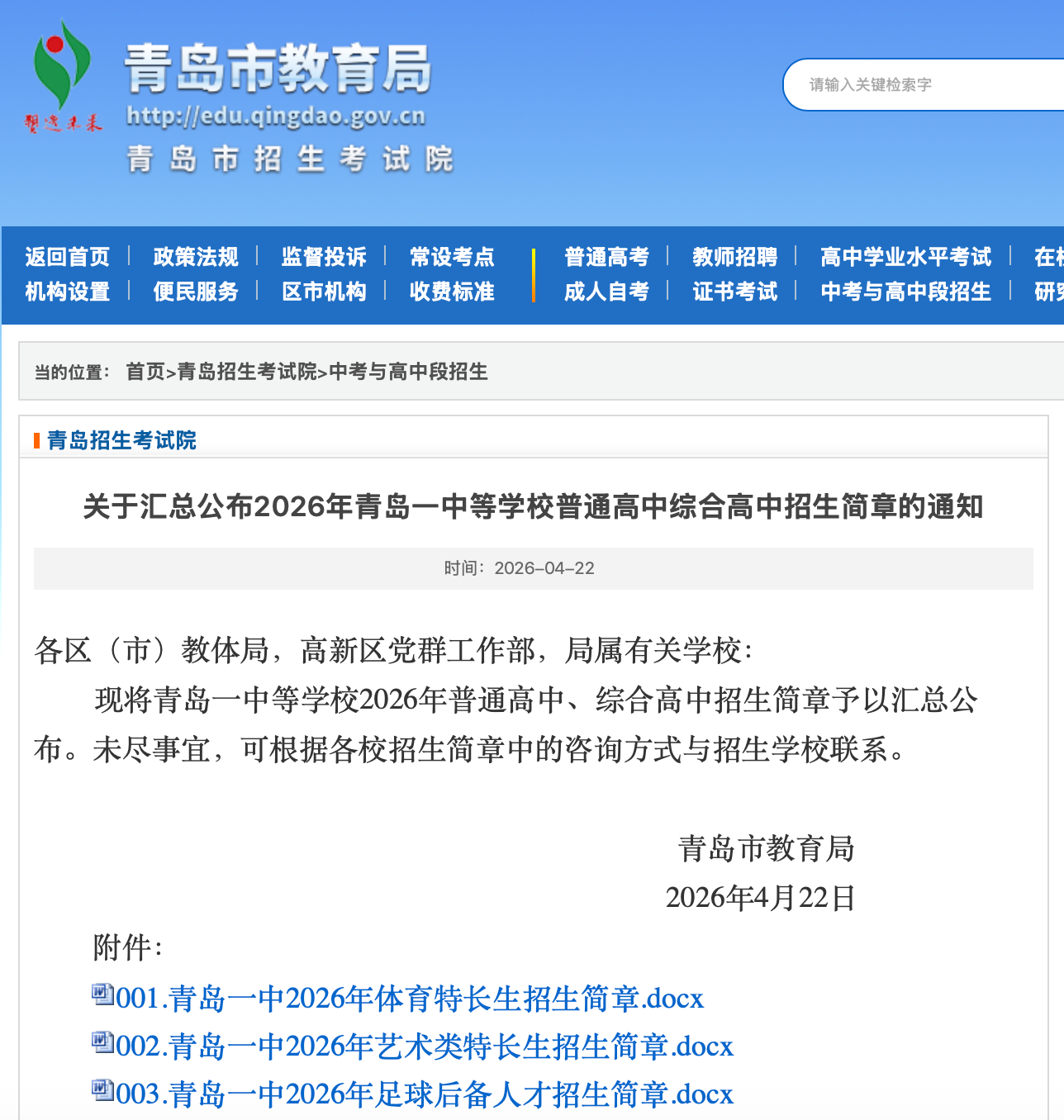 青岛日报社/观海新闻4月22日讯 今天,青岛市教育局汇总公布2026年青岛一中等普通高中、综合高中招生简章。