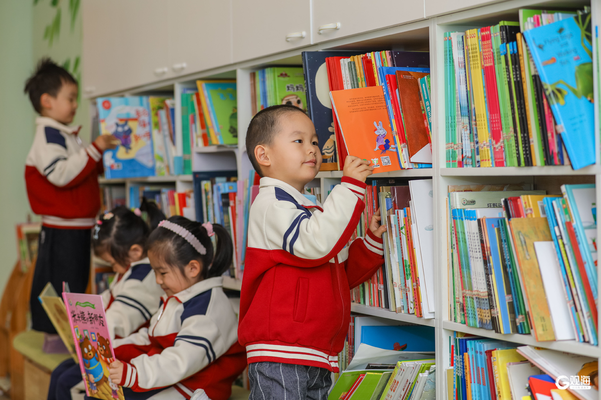小朋友在青岛市李沧区青山路幼儿园开展的“‘青’情阅读 阅润童心”活动中挑选、阅读图书。