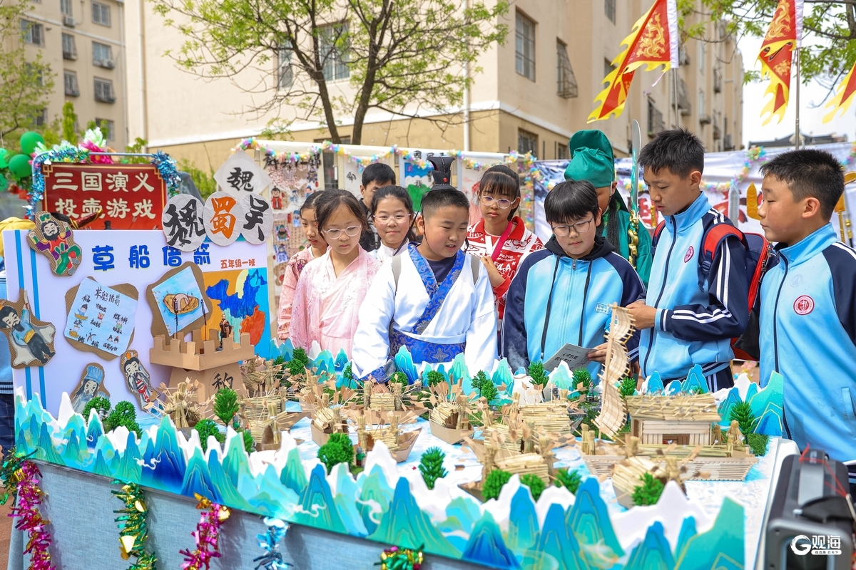 在青岛浮山路小学举办的“心怀热爱,阅见美好”读书节活动中,学生利用打造的实景介绍“草船借箭”成语故事。